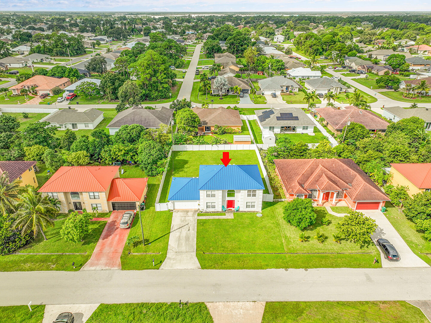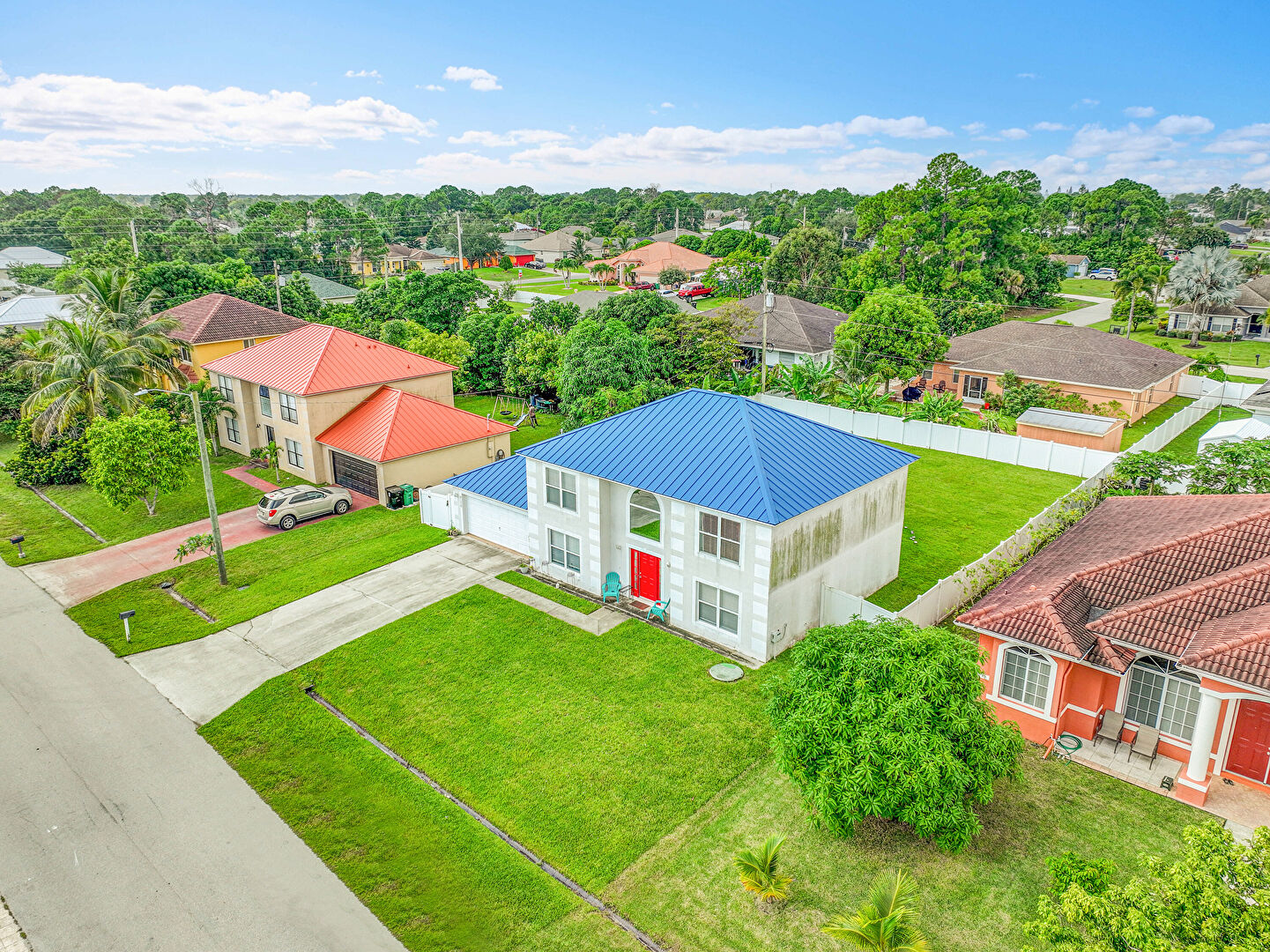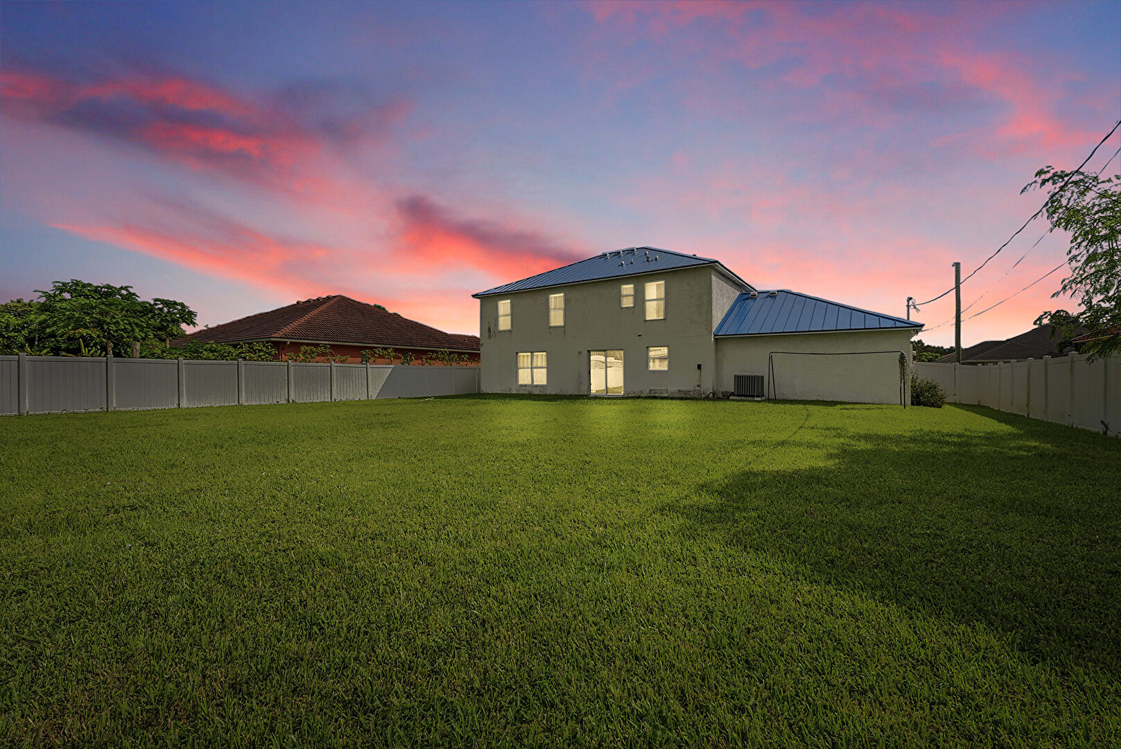 Driveway, Fence, Garage, Gate, Lawn, Metal Roof, Standing Seam Roof, Stucco Siding, Driveway, Metal Roof, Standing Seam Roof, Stucco Siding