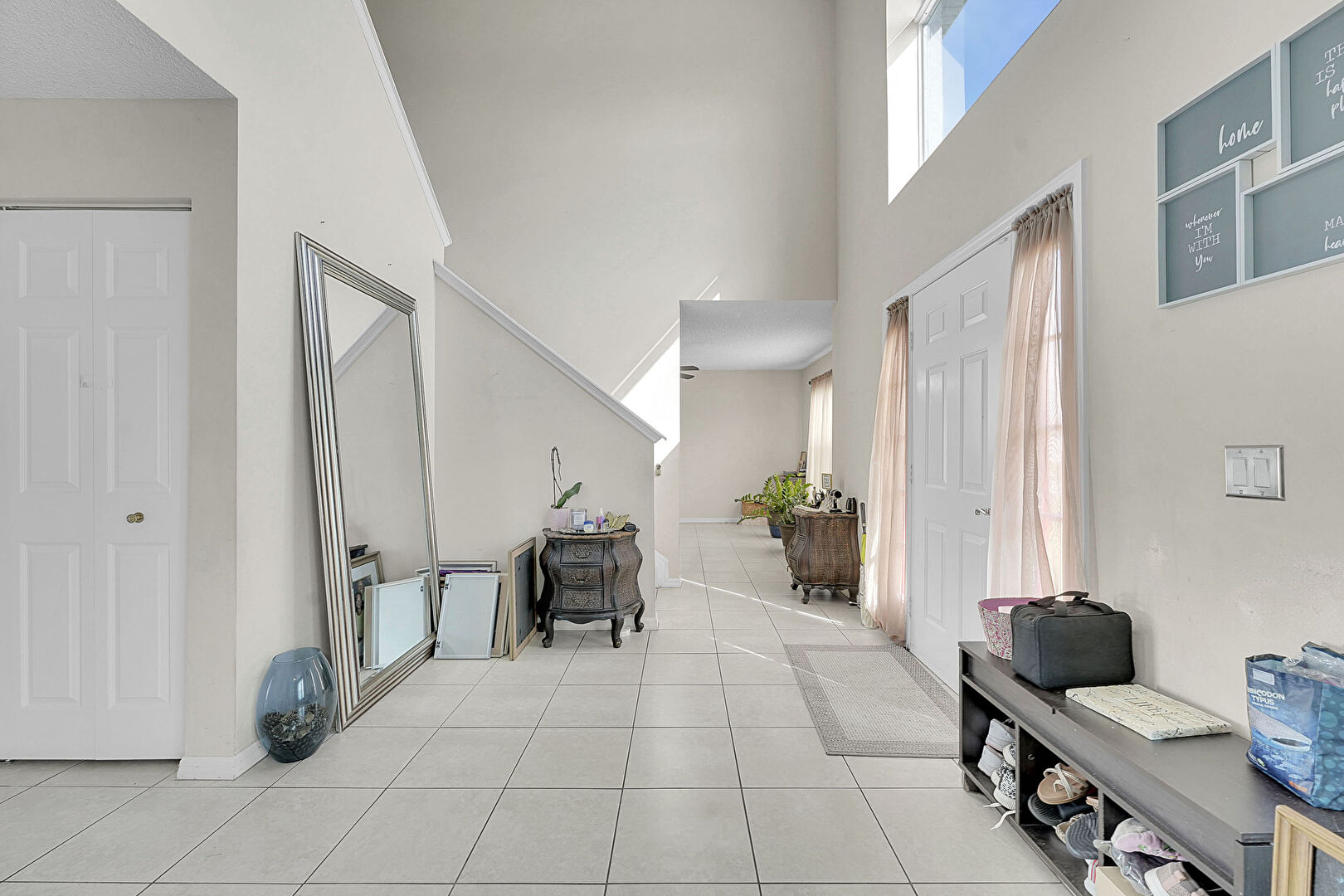 Drywall, High Ceiling, Natural Light, Tile Floor, Baseboards Wall
