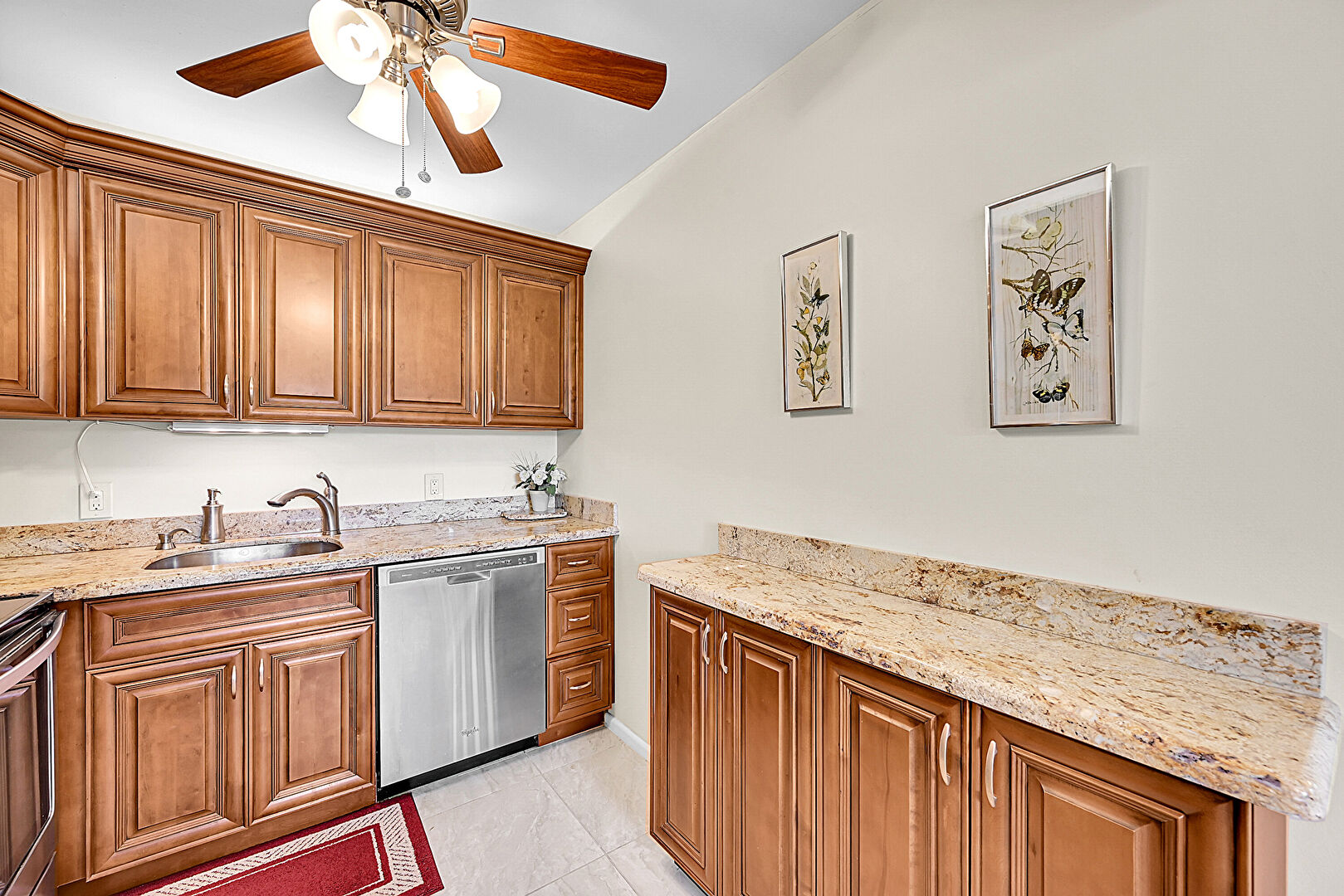 Baseboards Wall, Ceiling Fan, Crown Molding Cabinets, Drywall, Medium Brown Cabinets, Natural Light, Notable Chandelier, Pendant Lighting, Raised Cabinets, Stone Countertops, Tile Floor, Vaulted Ceiling, Crown Molding Cabinets, Medium Brown Cabinets