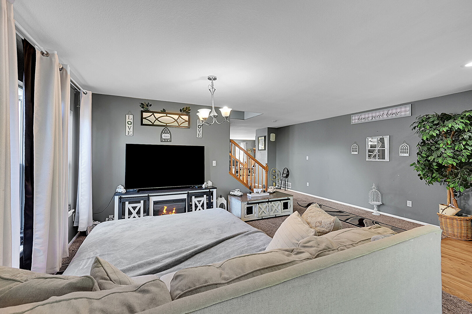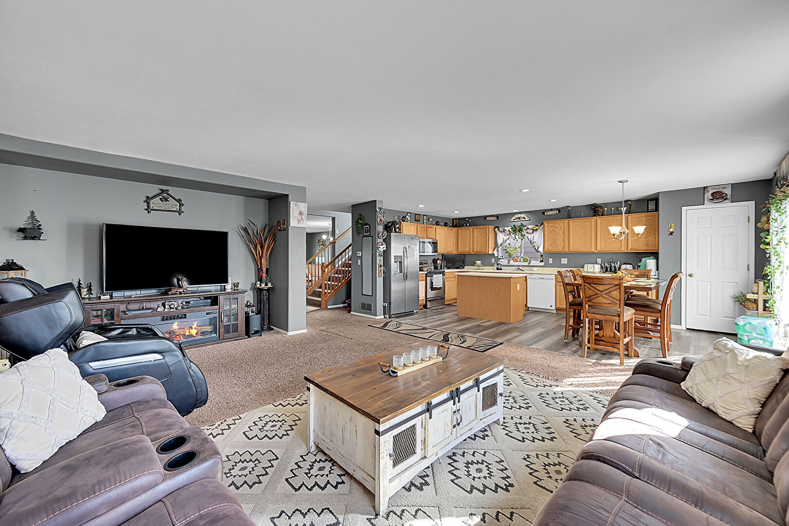 Baseboards Wall, Carpet, Drywall, L Shaped Kitchen, Natural Light, Notable Chandelier, Stairs, Fireplace, Recessed Lighting