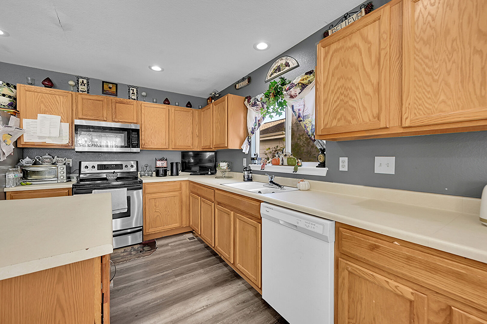Drywall, Kitchen Island, L Shaped Kitchen, Natural Light, Notable Chandelier, Pendant Lighting, Recessed Lighting, Shaker Cabinets, Toaster, Wood Finish Floor, Natural Light, Wood Finish Floor