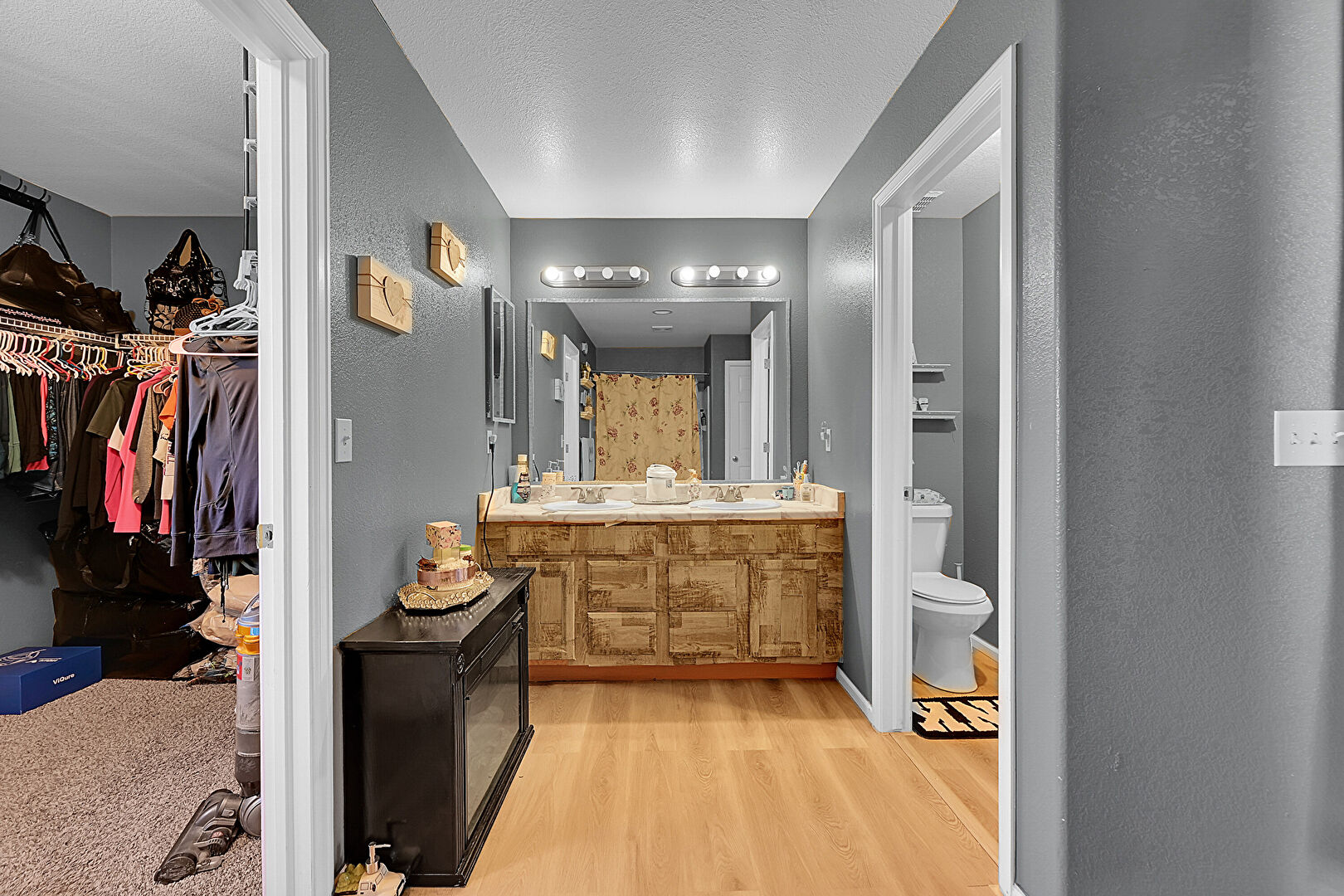 Baseboards Wall, Double Vanity, Full Bathroom, Textured Ceiling, Textured Wall, Water Closet, Wood Finish Floor, Walk In Closet