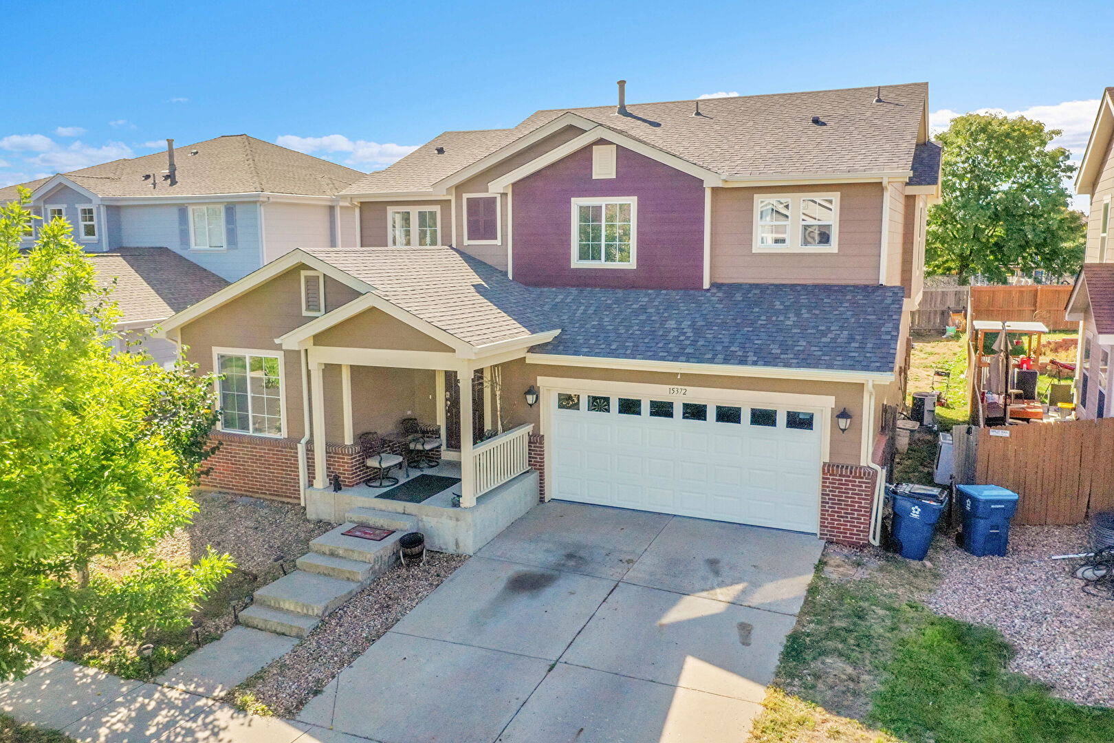 Brick Siding, Built In Garage, Downspout, Driveway, Fence, Gutters, Horizontal Siding, Porch, Residential View, Shingle Roof, Built In Garage, Driveway, Porch
