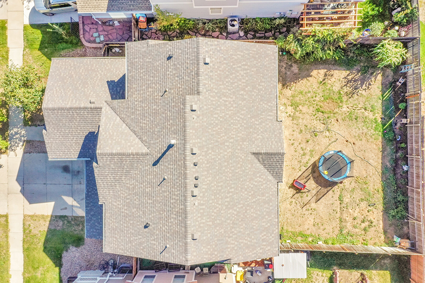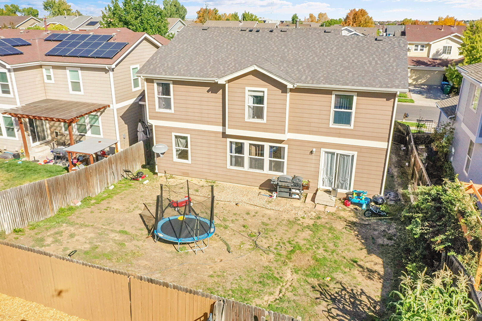 Downspout, Fence, Horizontal Siding, Patio, Pergola, Residential View, Satellite Dish, Shingle Roof, Trampoline, Gutters