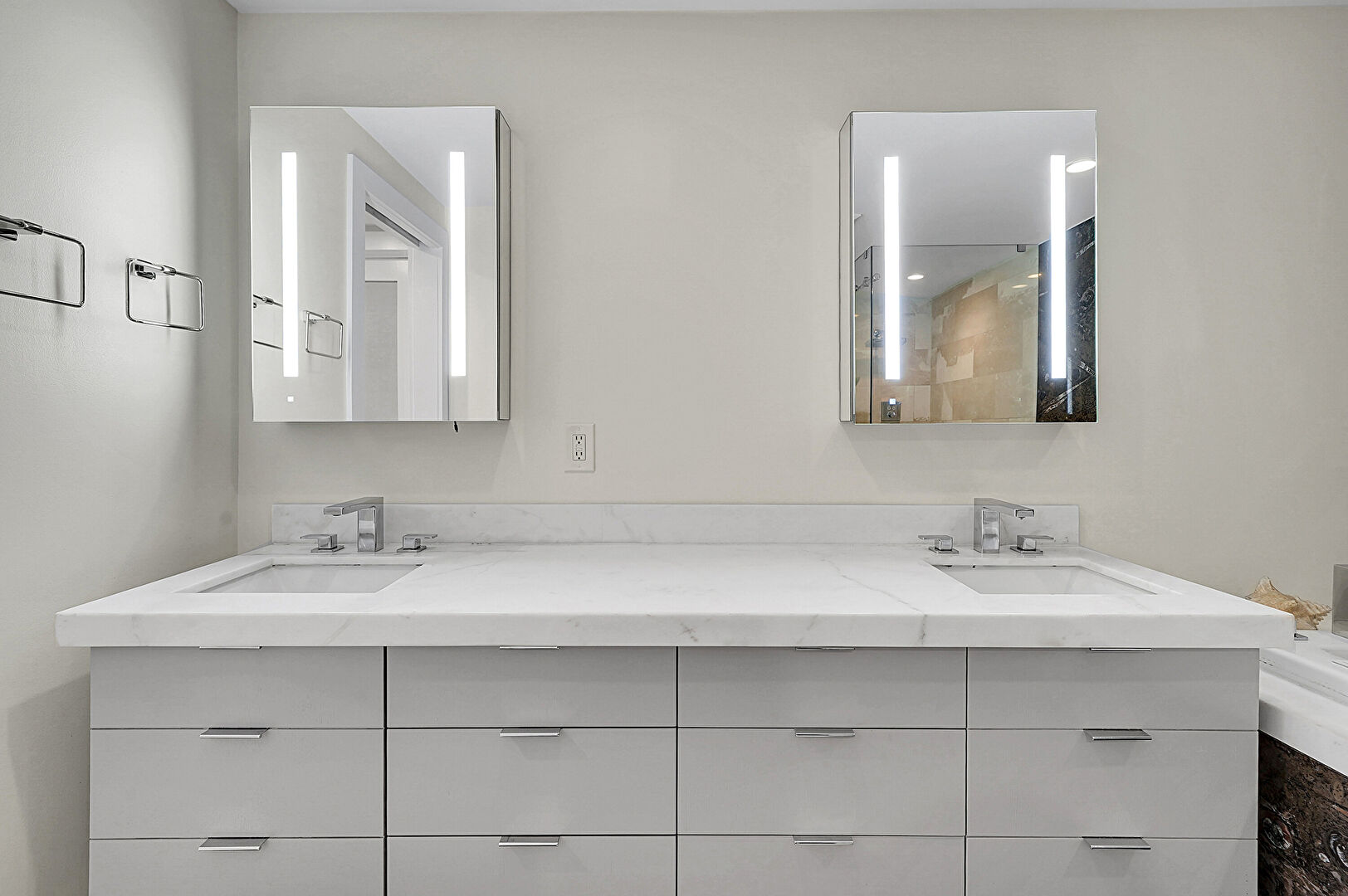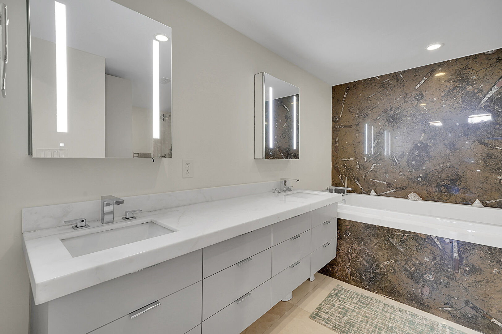 Baseboards Wall, Double Vanity, Drywall, Full Bathroom, Recessed Lighting, Tile Floor, Tile Wall, Vanity, Vent, Drywall, Recessed Lighting, Vanity