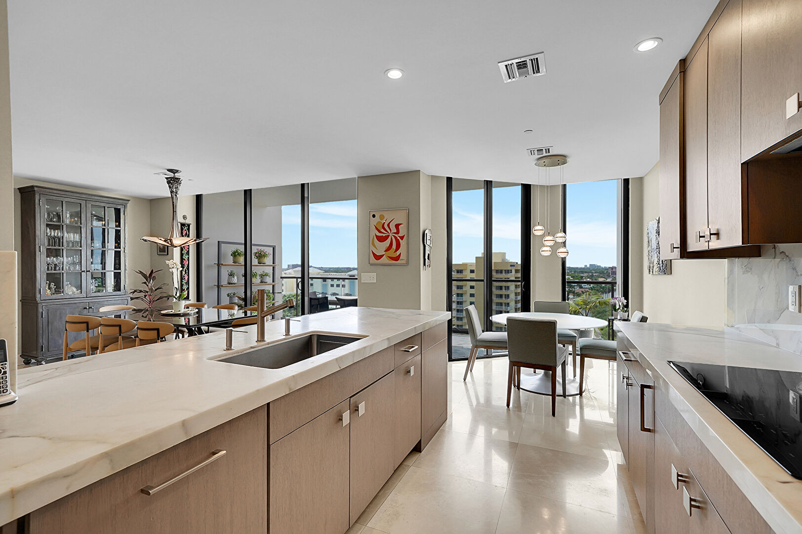 Baseboards Wall, Double Oven, Drywall, Flat Panel Cabinets, Floor Ceiling Windows, Kitchen Island, Kitchen Peninsula, Natural Light, Notable Chandelier, Opens To Living Area, Pass Through Window, Pendant Lighting, Recessed Lighting, Shaker Cabinets, Stone Countertops, Tile Floor, Vent, Warming Drawer, Wine Cooler, Baseboards Wall, Flat Panel Cabinets, Medium Brown Cabinets, Pendant Lighting, Stone Countertops, Tile Floor, Vent