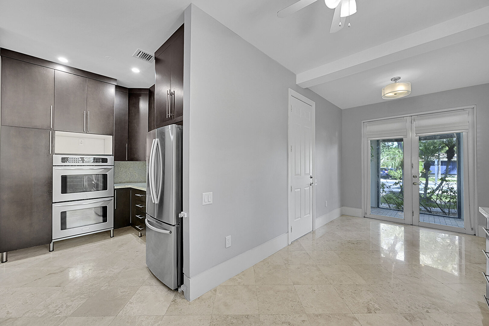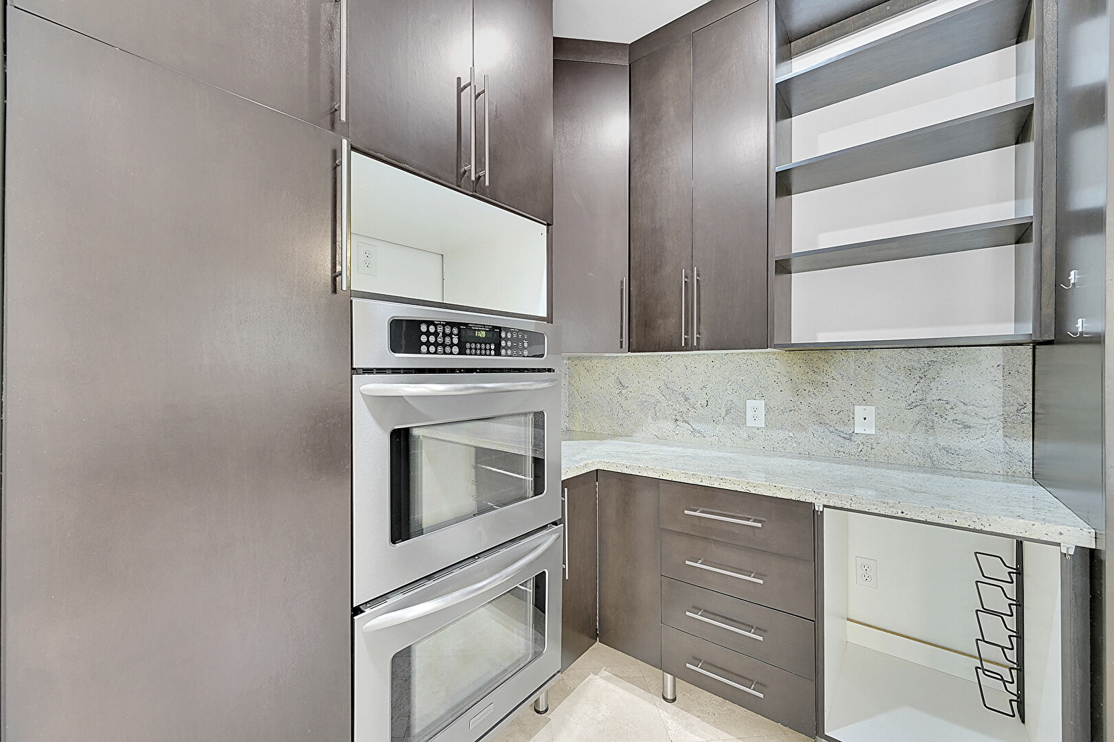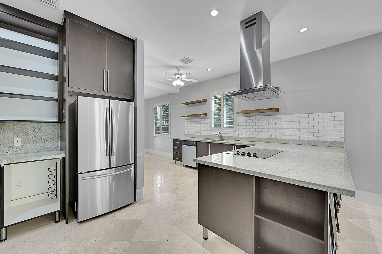 Baseboards Wall, Beamed Ceiling, Ceiling Fan, Dark Brown Cabinets, Double Oven, Drywall, Flat Panel Cabinets, French Doors, Kitchen Bar, Kitchen Island, Kitchen Peninsula, Natural Light, Open Shelves, Opens To Living Area, Pendant Lighting, Recessed Lighting, Smoke Carbon Monoxide Detector, Stone Countertops, Tile Floor, U Shaped Kitchen, Vent, Baseboards Wall, Dark Brown Cabinets, Drywall, Flat Panel Cabinets, Opens To Living Area