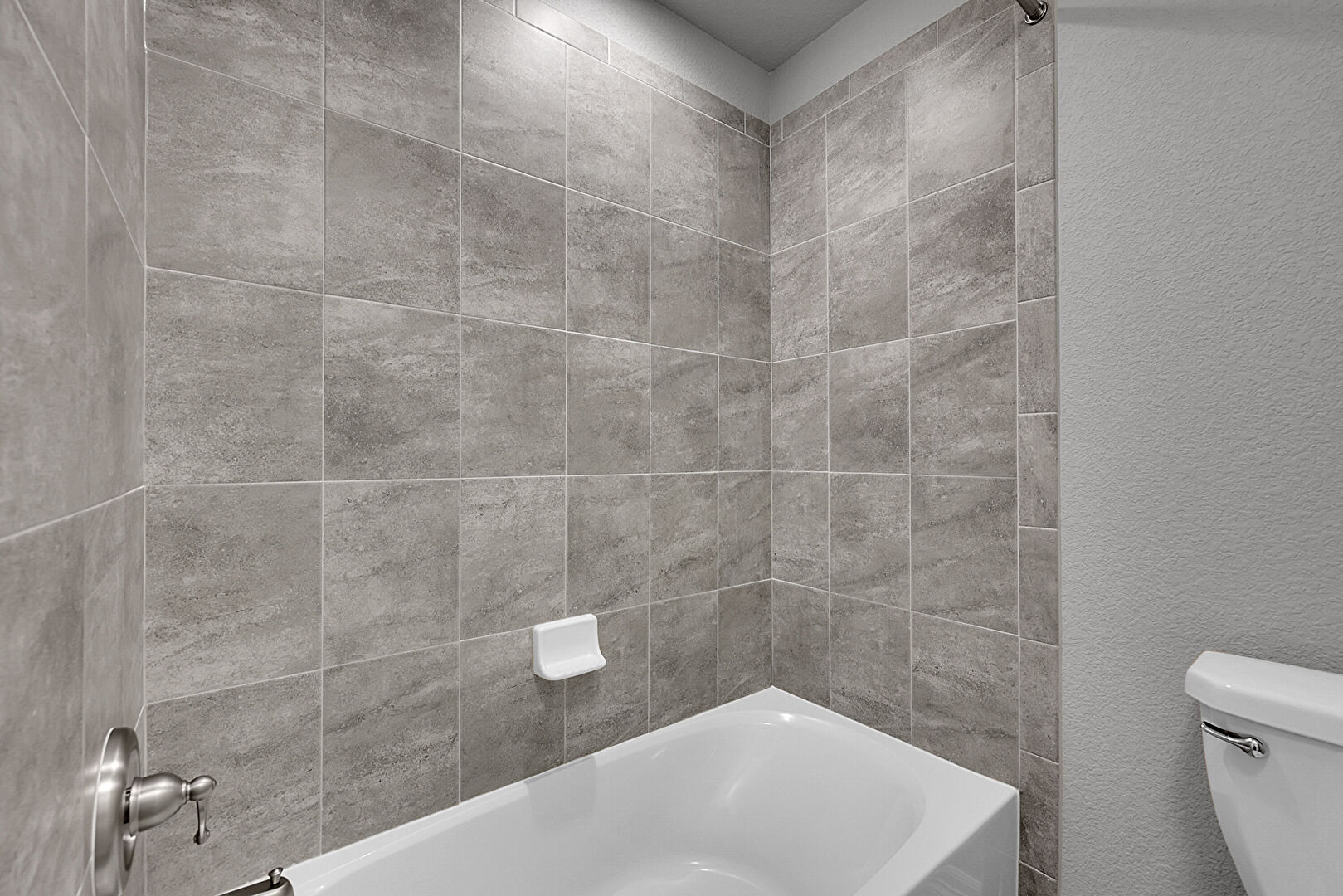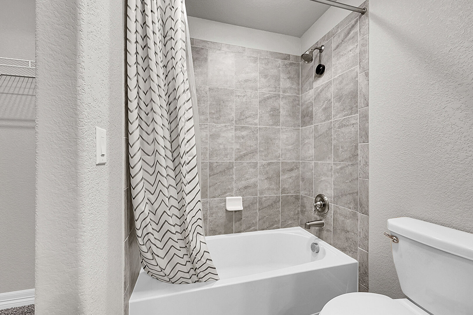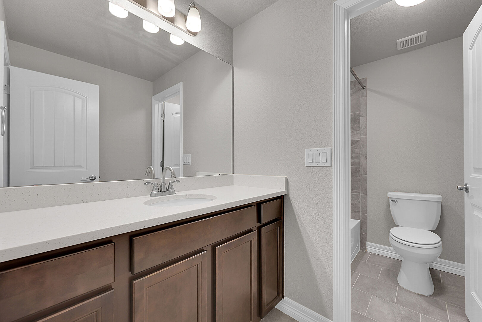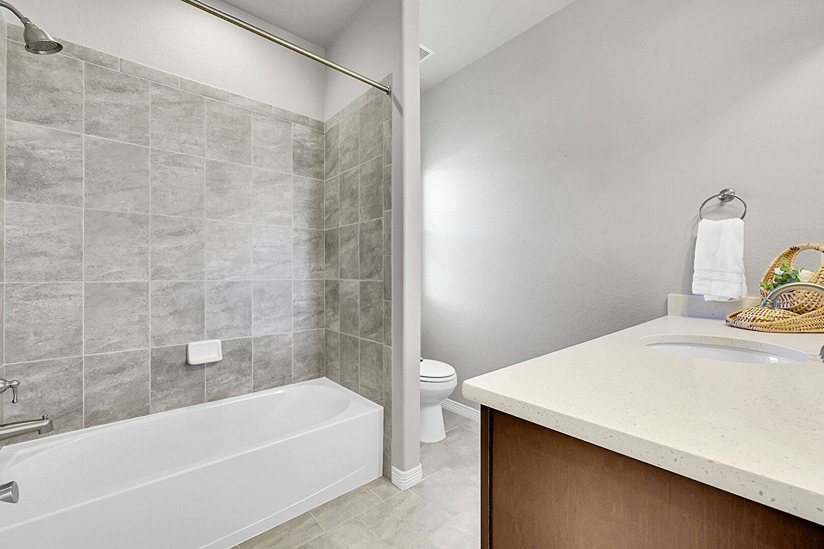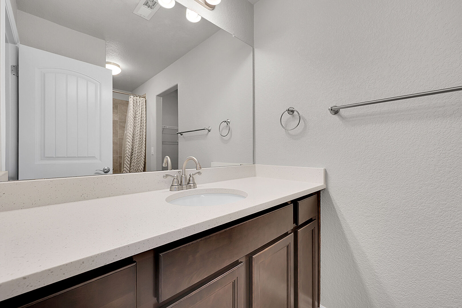 Baseboards Wall, Combined Bath Shower, Full Bathroom, Textured Wall, Tile Floor, Vanity, Vent, Combined Bath Shower, Full Bathroom, Textured Wall, Vanity, Vent