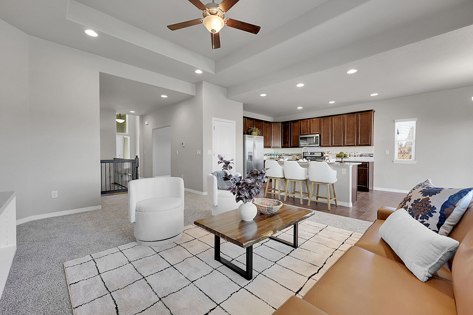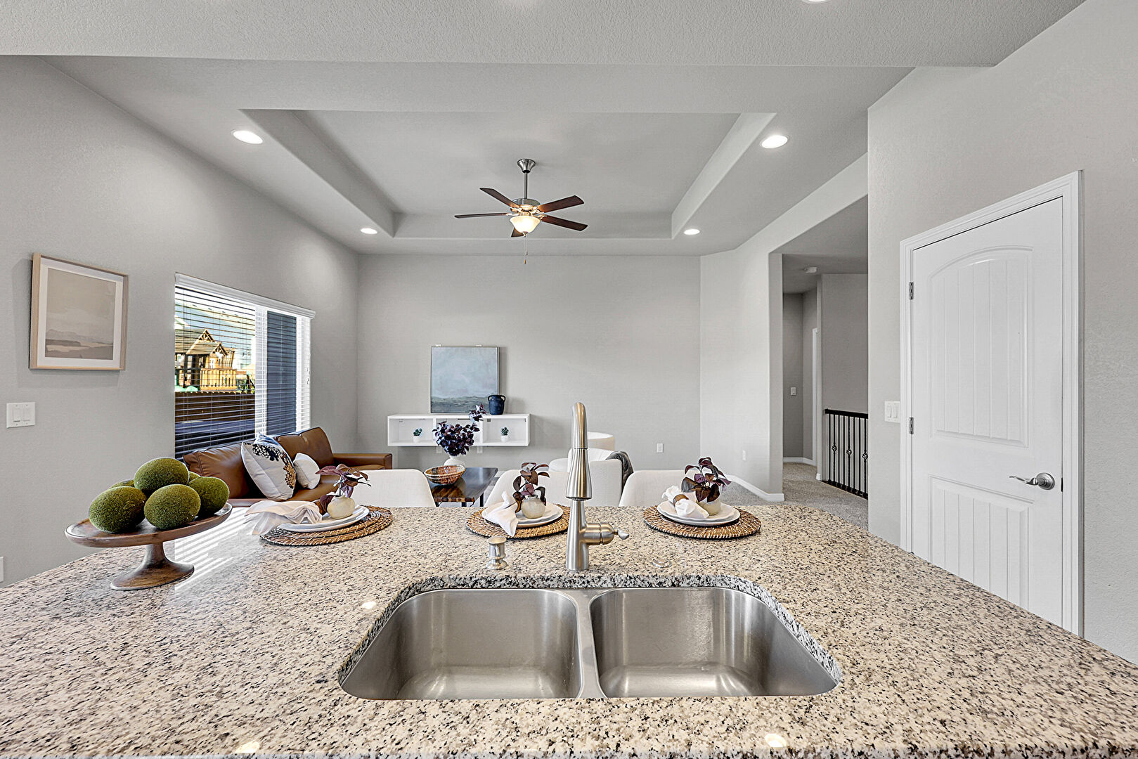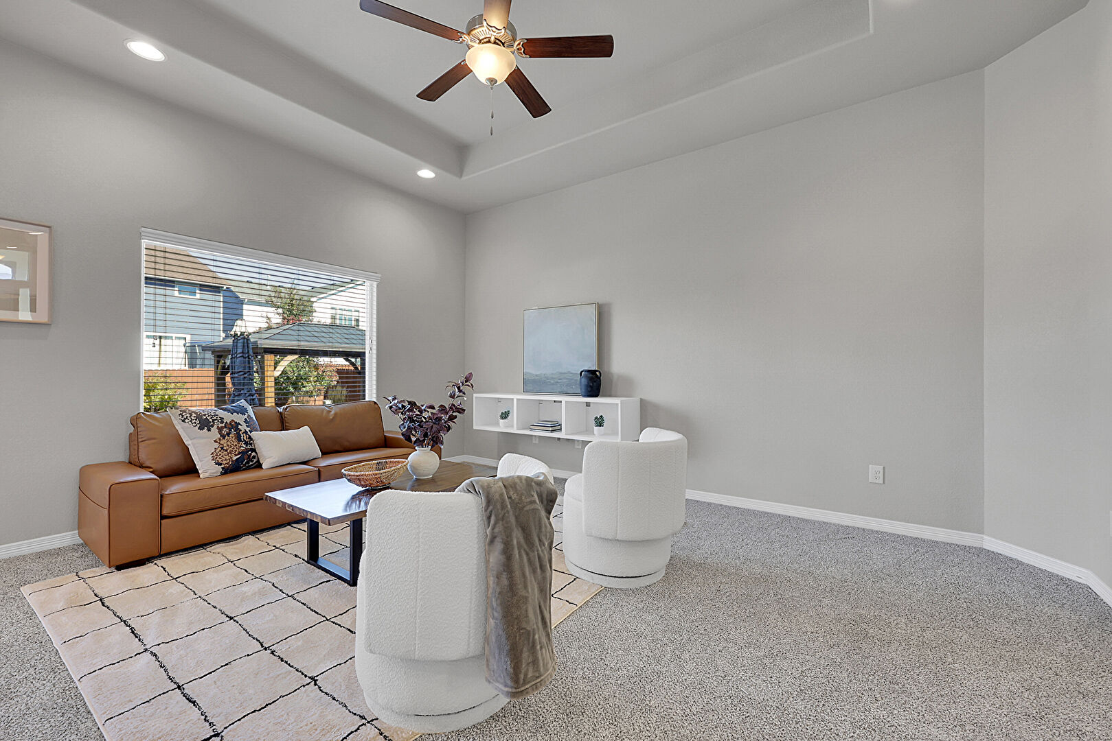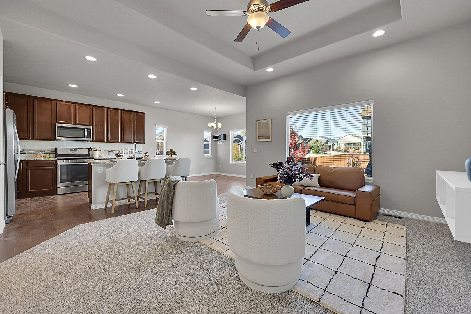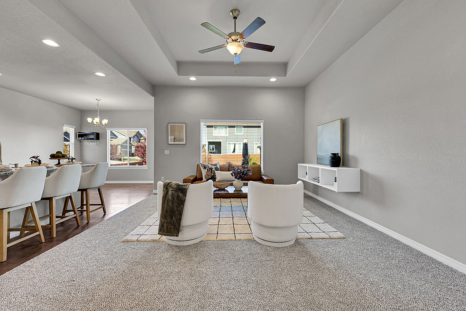Baseboards Wall, Carpet, Ceiling Fan, Drywall, L Shaped Kitchen, Natural Light, Notable Chandelier, Recessed Lighting, Tray Ceiling, Ceiling Fan, Drywall, L Shaped Kitchen, Natural Light