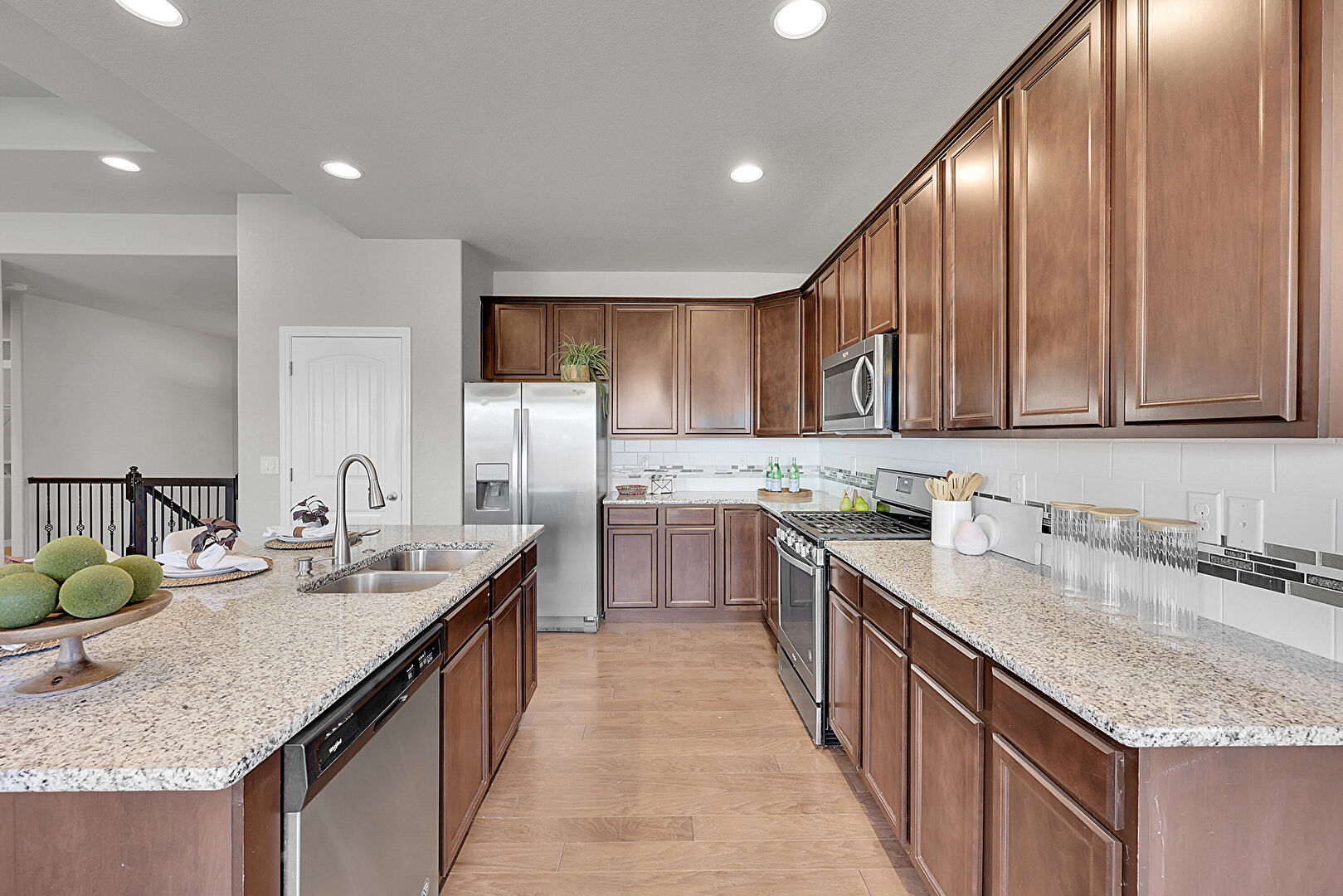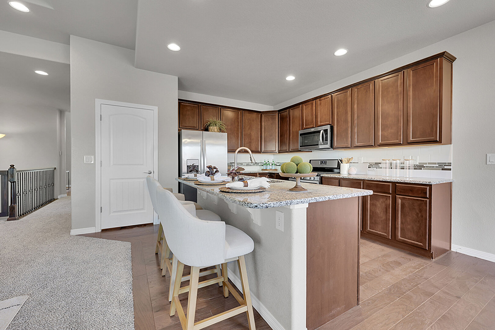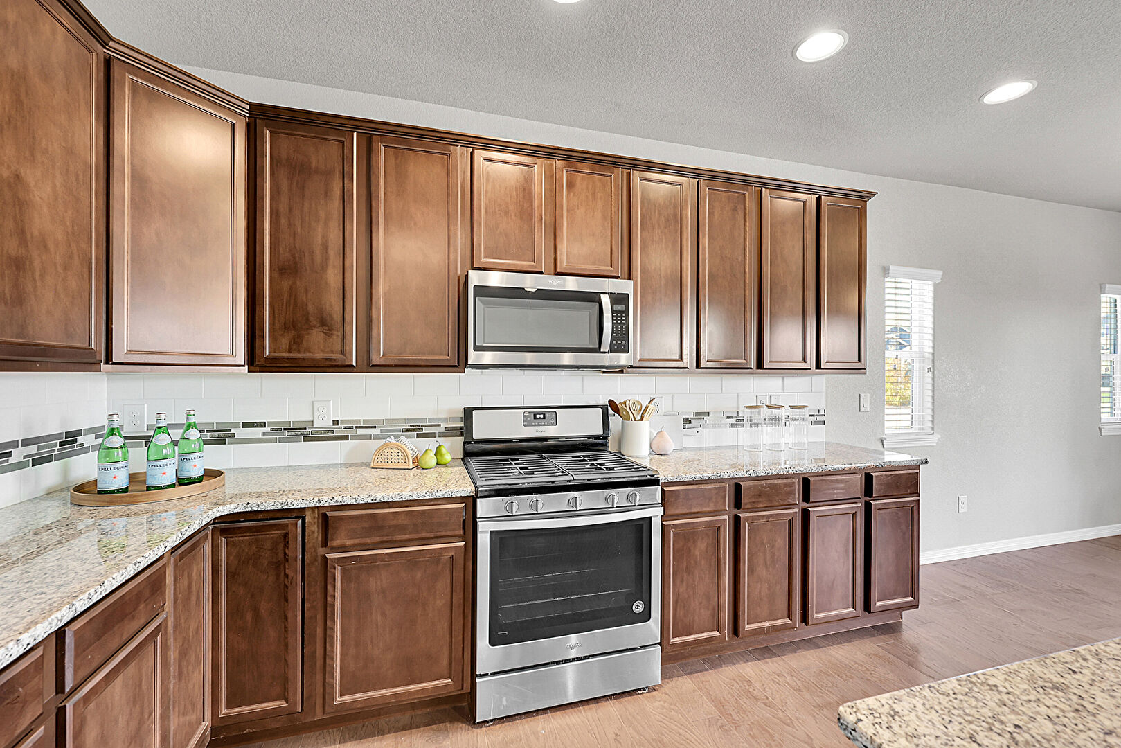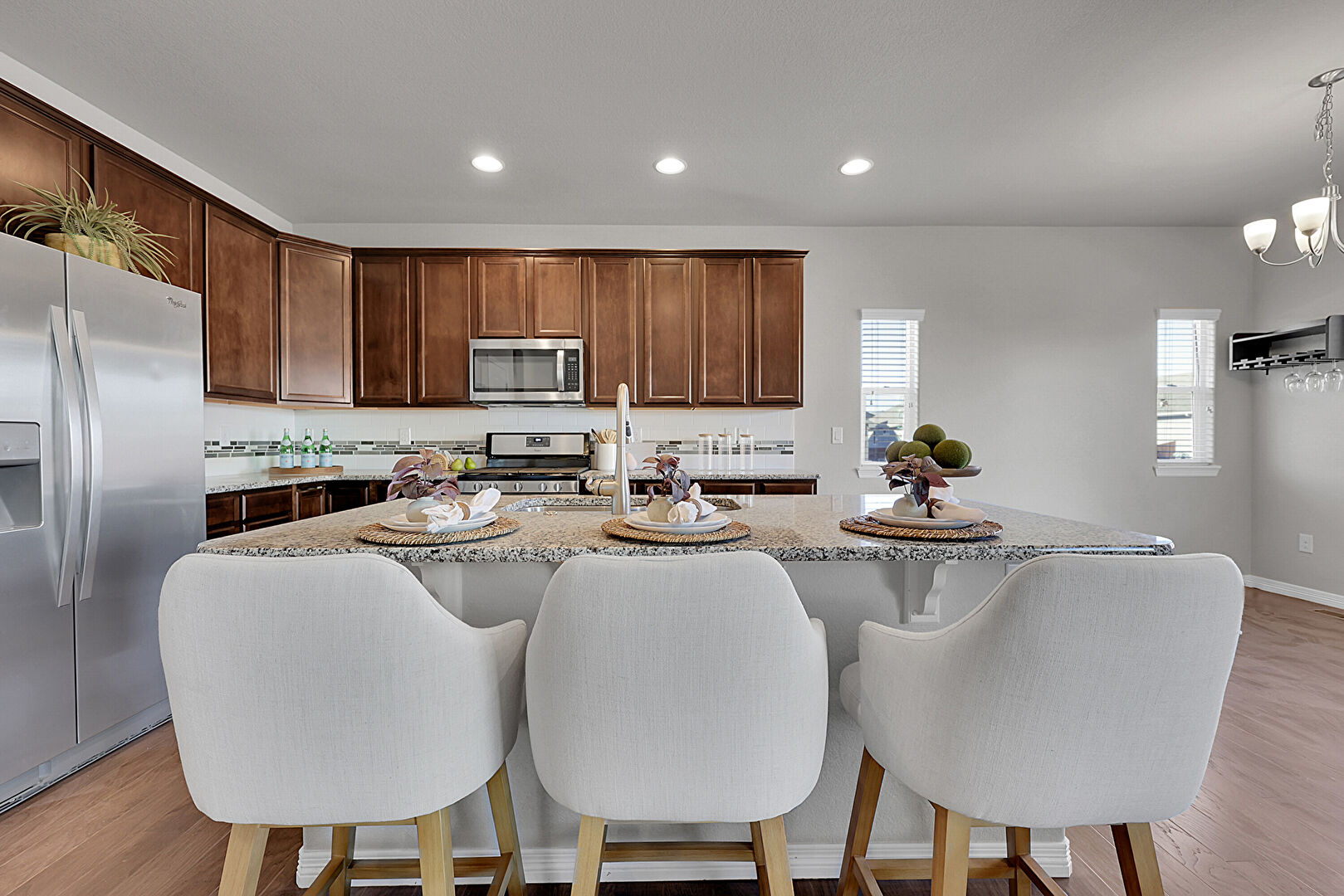 Baseboards Wall, Ceiling Fan, Crown Molding Cabinets, Dark Brown Cabinets, Drywall, Kitchen Bar, Kitchen Island, L Shaped Kitchen, Natural Light, Notable Chandelier, Opens To Living Area, Pendant Lighting, Recessed Lighting, Shaker Cabinets, Stone Countertops, Textured Ceiling, Tray Ceiling, Wood Finish Floor, Baseboards Wall, Drywall, Kitchen Island, L Shaped Kitchen