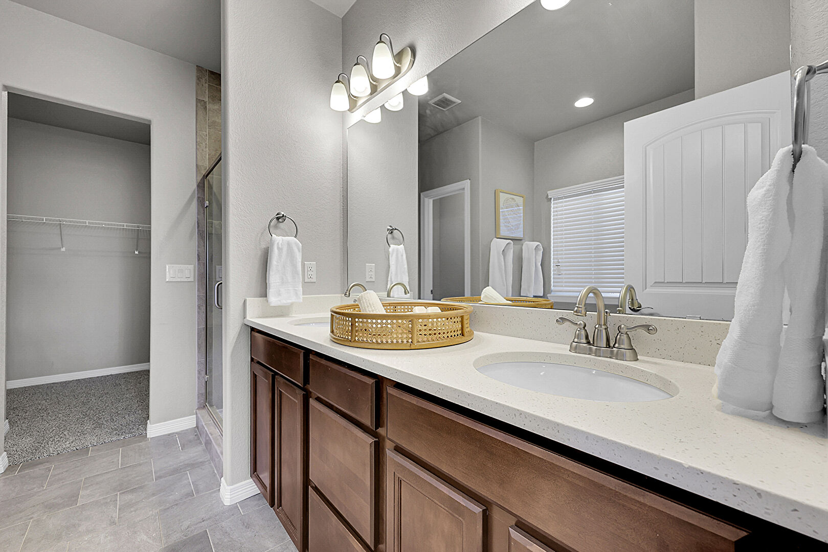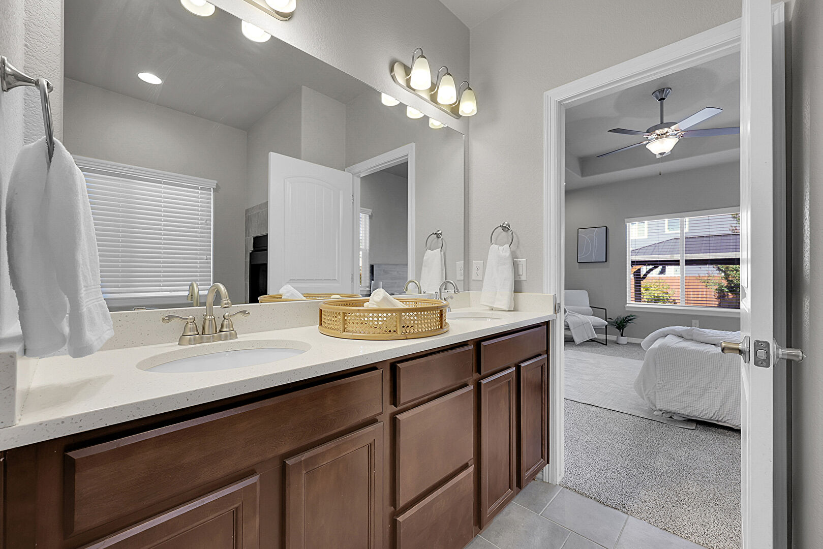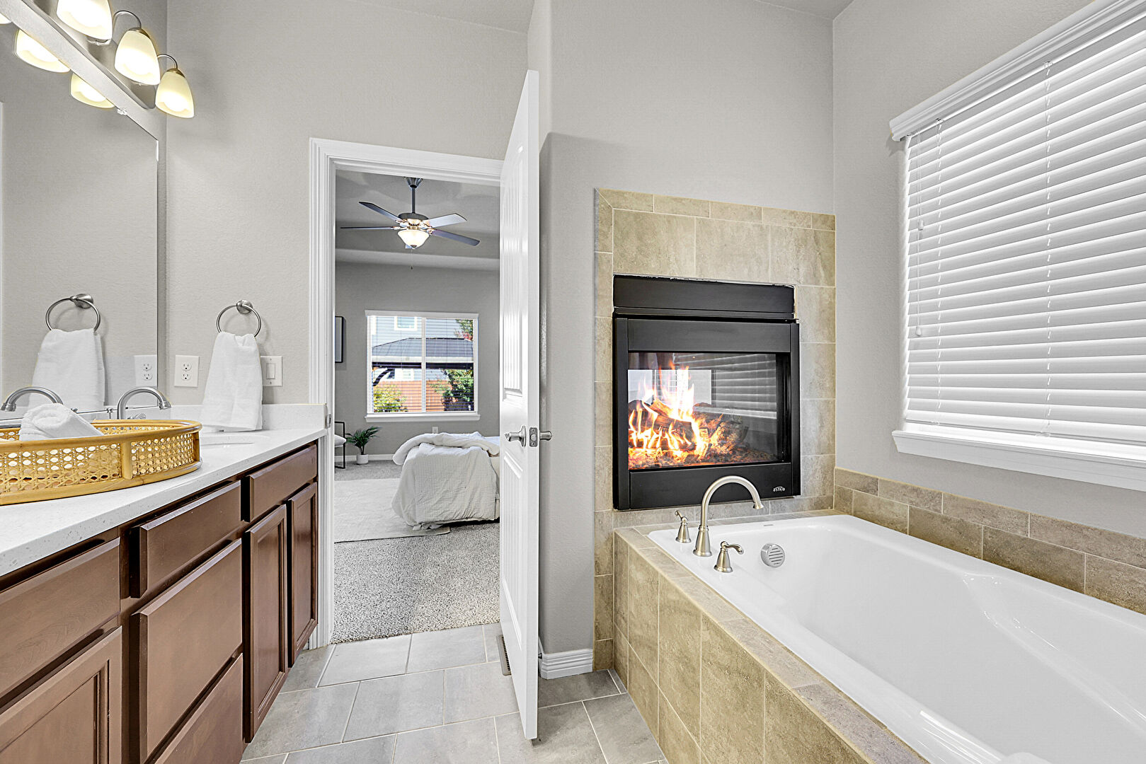 Baseboards Wall, Carpet, Ceiling Fan, Double Vanity, Drywall, Ensuite Bathroom, Fireplace, Full Bathroom, Natural Light, Recessed Lighting, Textured Ceiling, Tile Floor, Vent, Walk In Closet, Baseboards Wall, Double Vanity, Full Bathroom, Vanity