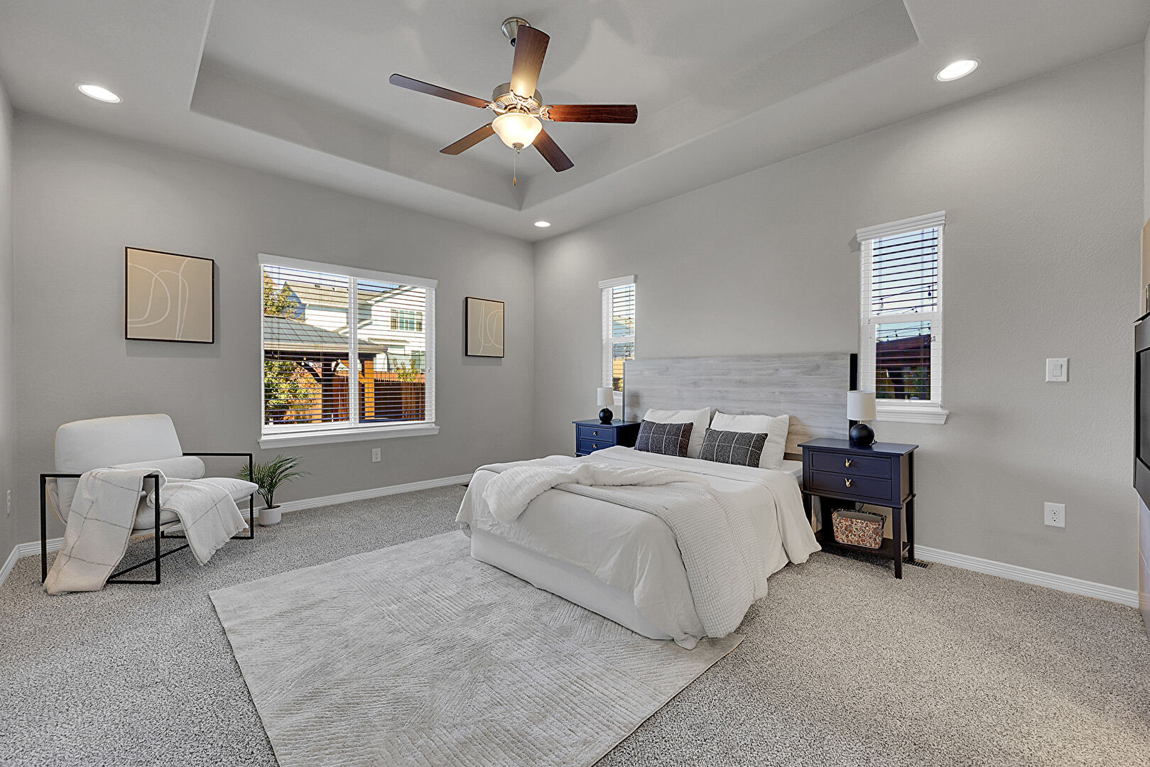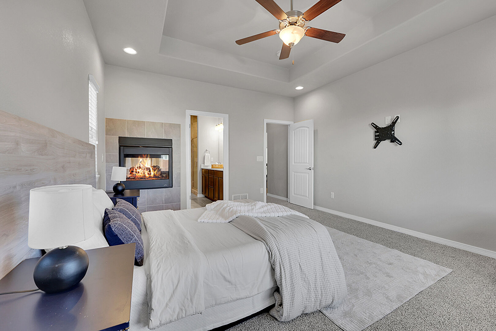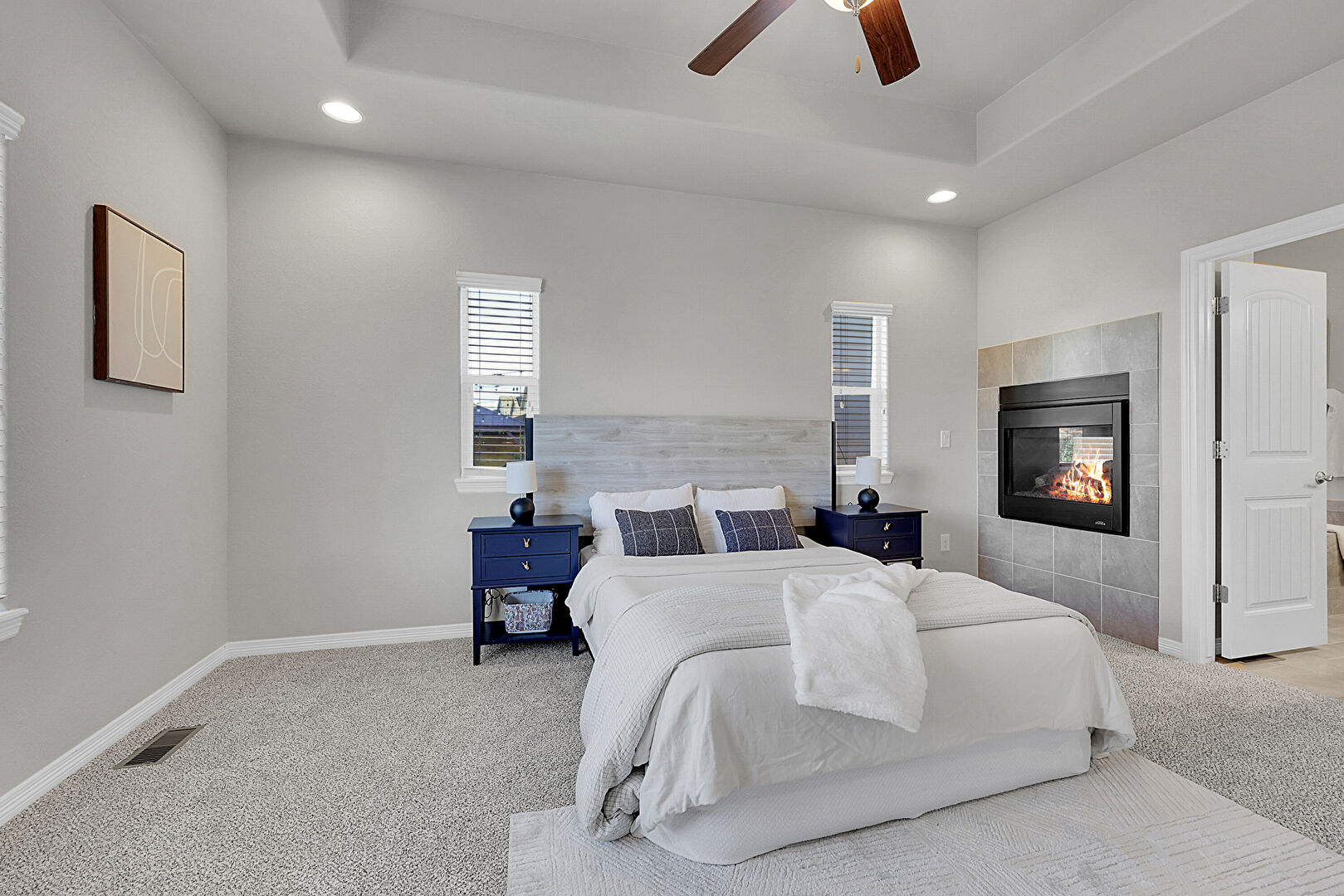 Baseboards Wall, Carpet, Ceiling Fan, Drywall, Ensuite Bathroom, Fireplace, Natural Light, Recessed Lighting, Tray Ceiling, Vent, Drywall, Tray Ceiling, Vent