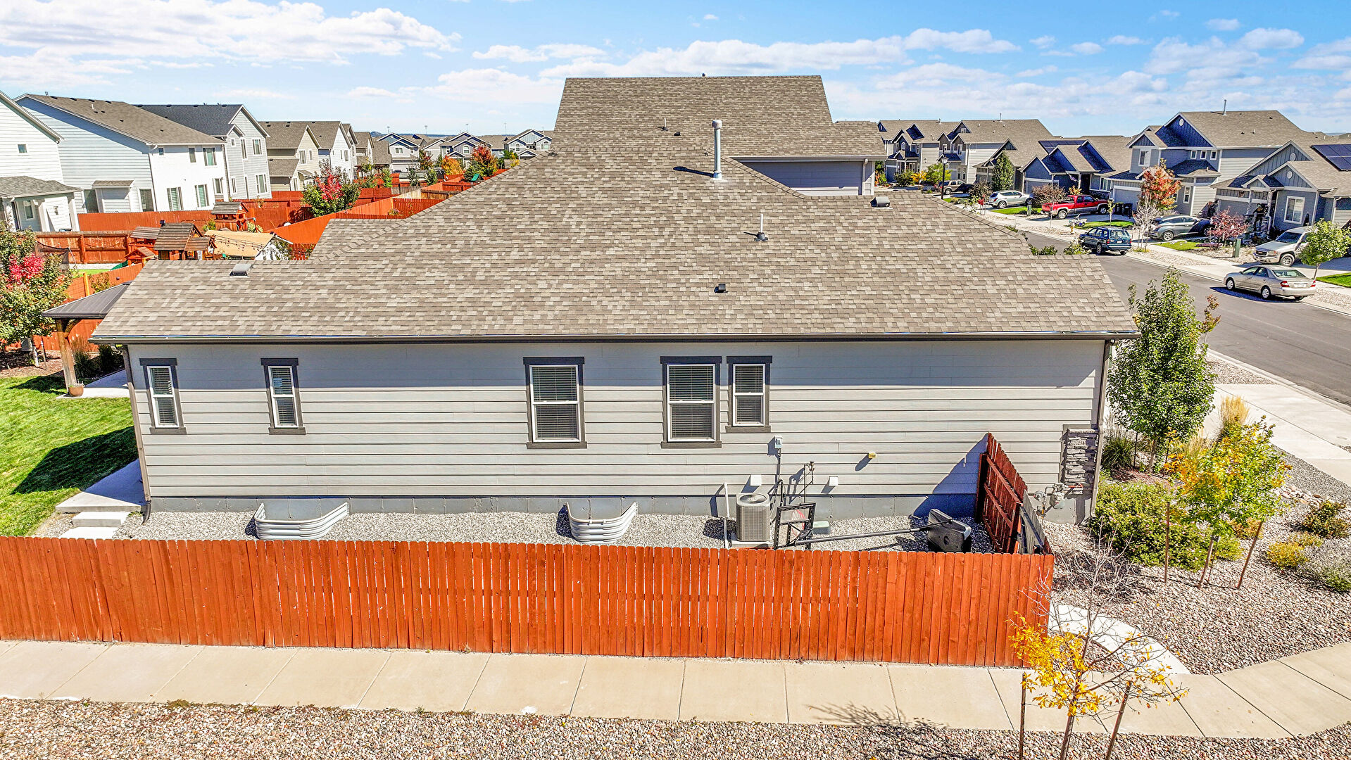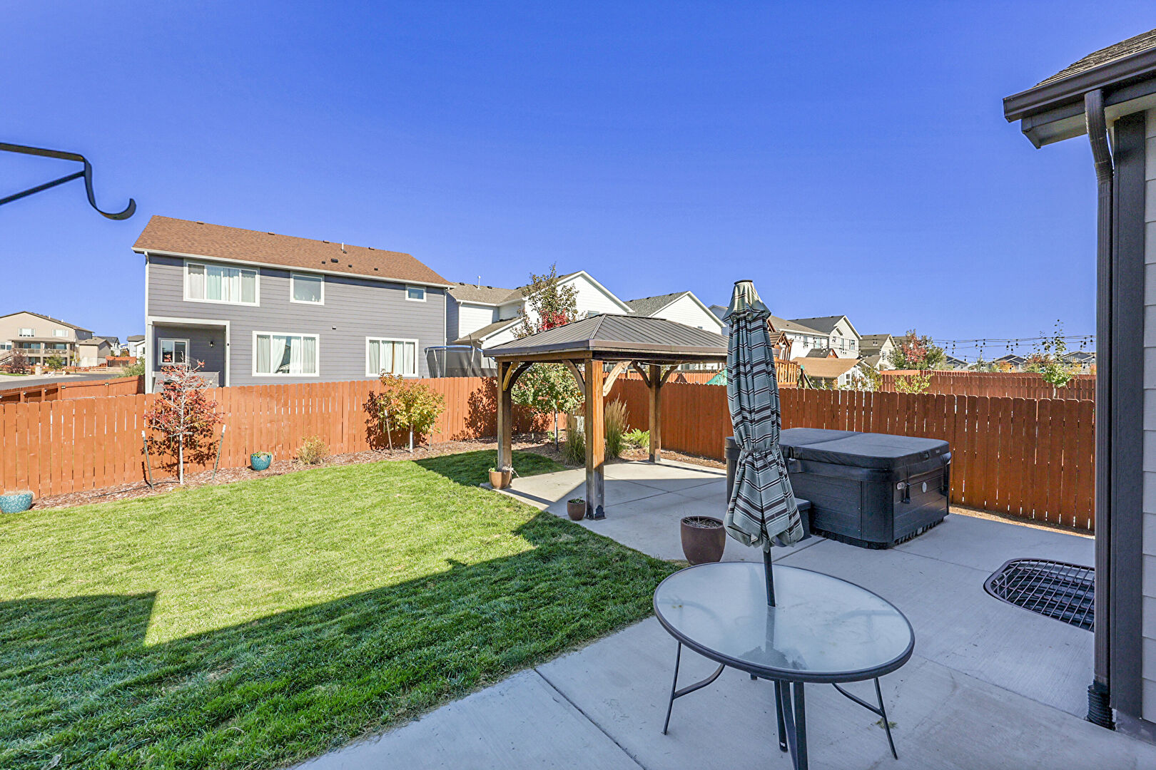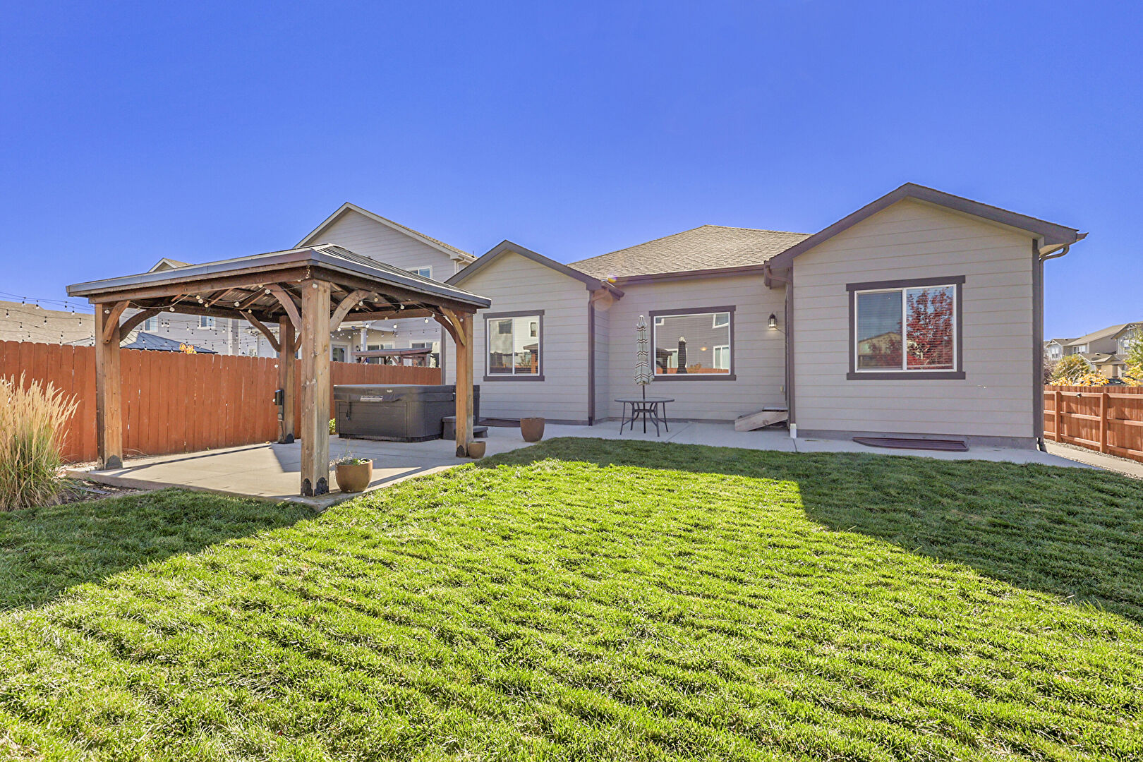 Downspout, Fence, Gazebo, Gutters, Horizontal Siding, Hot Tub, Lawn, Patio, Residential View, Shingle Roof, Concrete Foundation, Fence