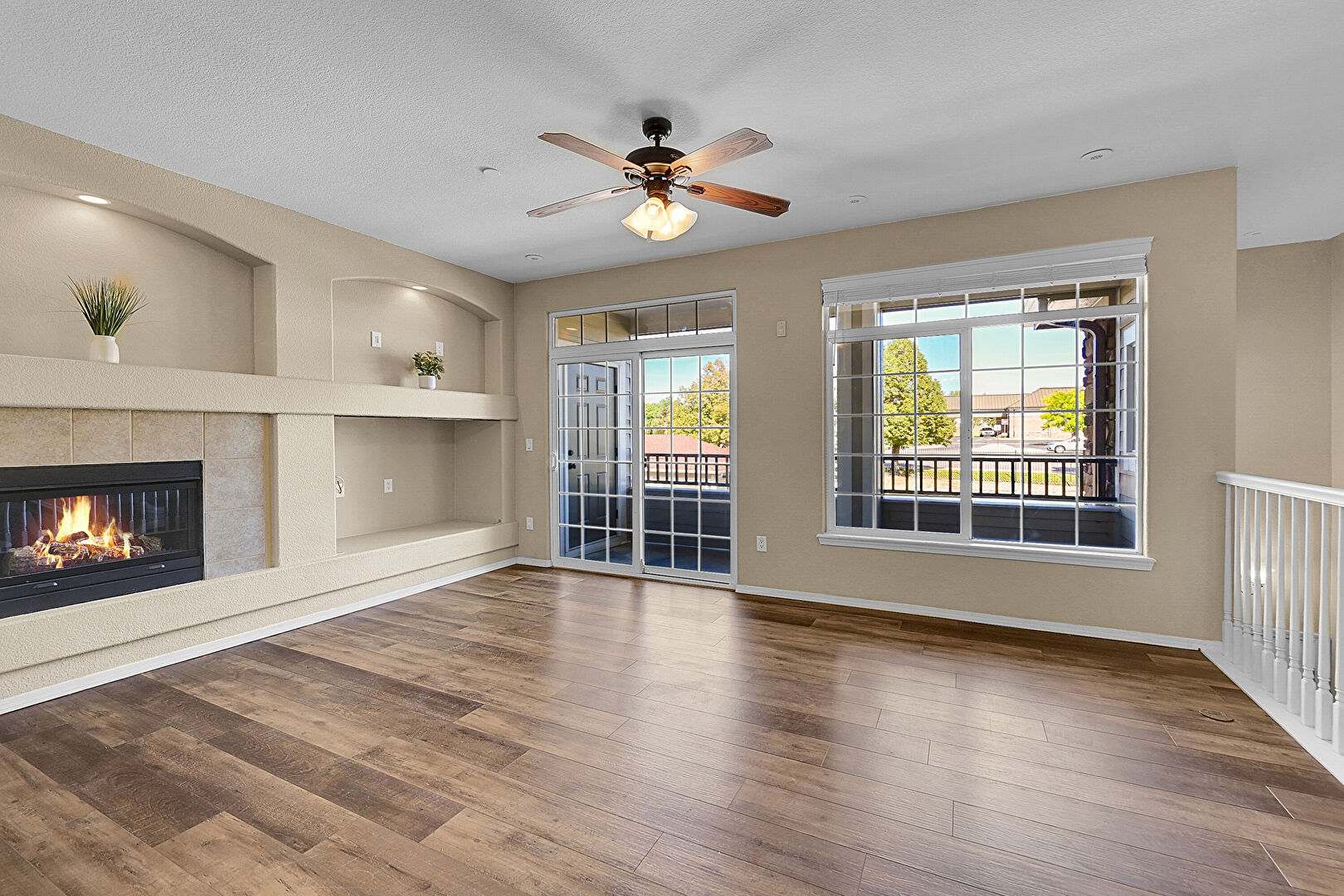 Baseboards Wall, Built In Shelves, Ceiling Fan, Drywall, Fireplace, Natural Light, Wood Finish Floor, Ceiling Fan, Textured Ceiling