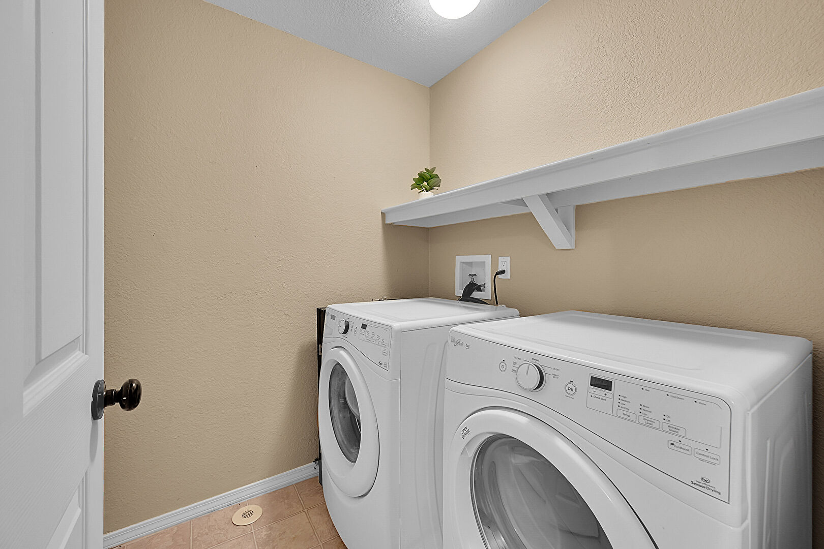 Laundry, Textured Ceiling, Textured Wall, Tile Floor, Washer Hookup, Baseboards Wall