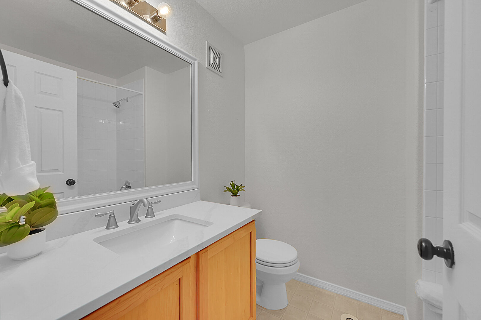Baseboards Wall, Full Bathroom, Textured Wall, Tile Floor, Vanity, Vent, Combined Bath Shower, Drywall