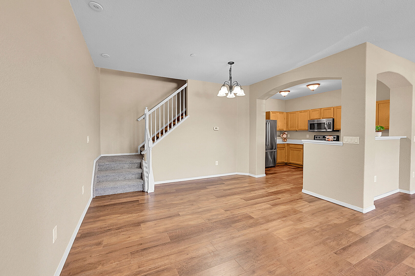 Arched Walkways, Baseboards Wall, Ceiling Fan, Drywall, Natural Light, Notable Chandelier, Opens To Living Area, Pass Through Window, Pendant Lighting, Shaker Cabinets, Stairs, Wood Finish Floor, Arched Walkways, Wood Finish Floor