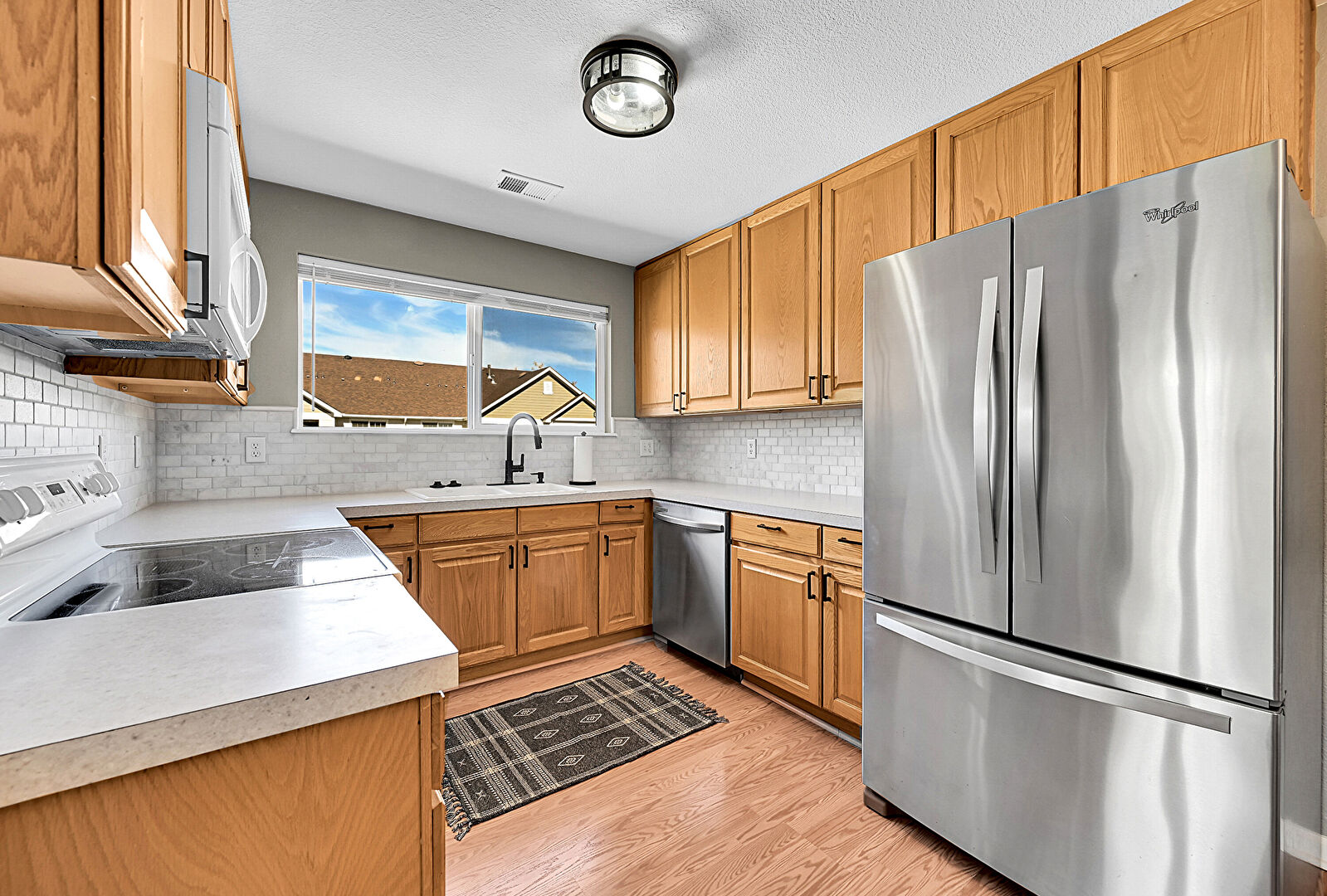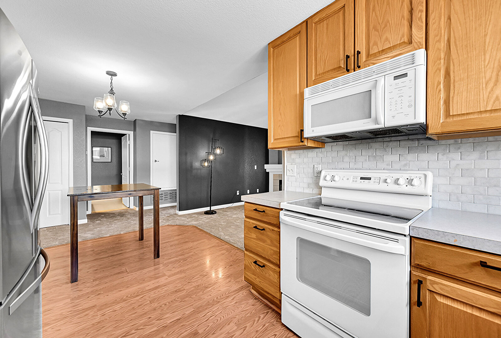 Baseboards Wall, Carpet, Cathedral Ceiling, Drywall, Fireplace, Medium Brown Cabinets, Natural Light, Notable Chandelier, Opens To Living Area, Pendant Lighting, Raised Cabinets, Textured Ceiling, U Shaped Kitchen, Vaulted Ceiling, Vent, Wood Finish Floor, Medium Brown Cabinets, Natural Light, Raised Cabinets, Textured Ceiling, U Shaped Kitchen, Vent