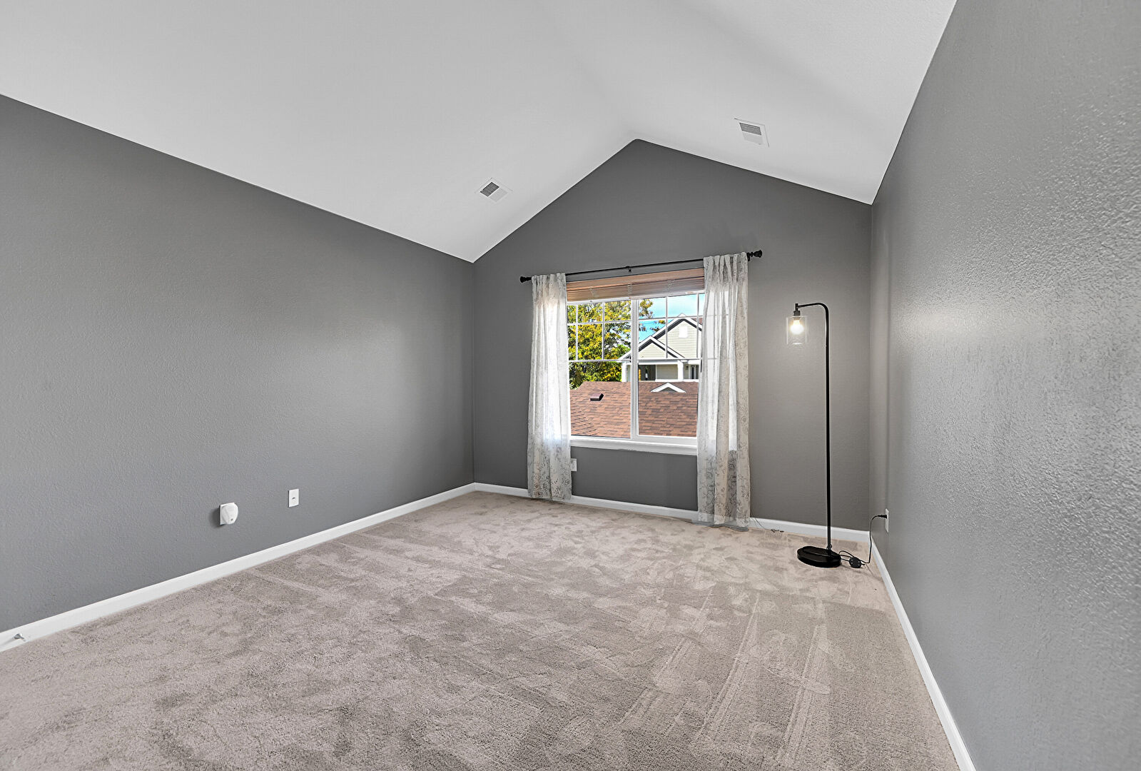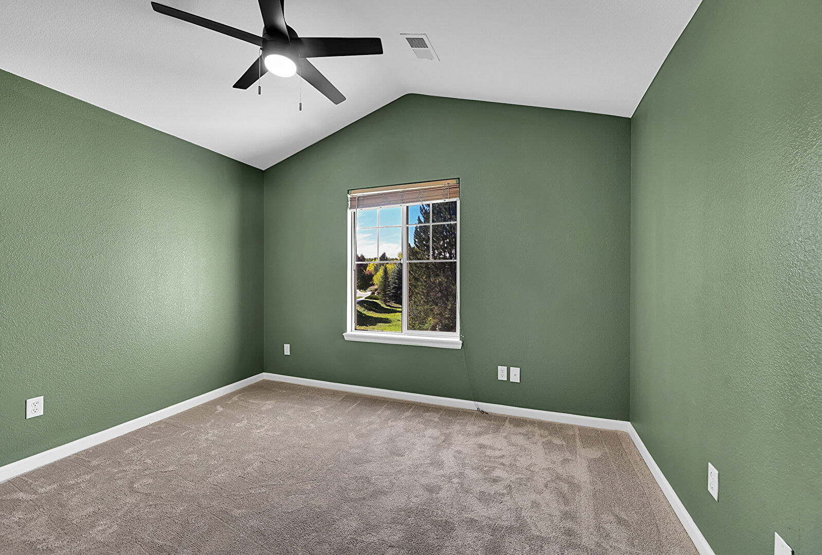 Baseboards Wall, Carpet, Cathedral Ceiling, Ceiling Fan, Drywall, Natural Light, Textured Wall, Vaulted Ceiling, Vent, Ceiling Fan, Vaulted Ceiling