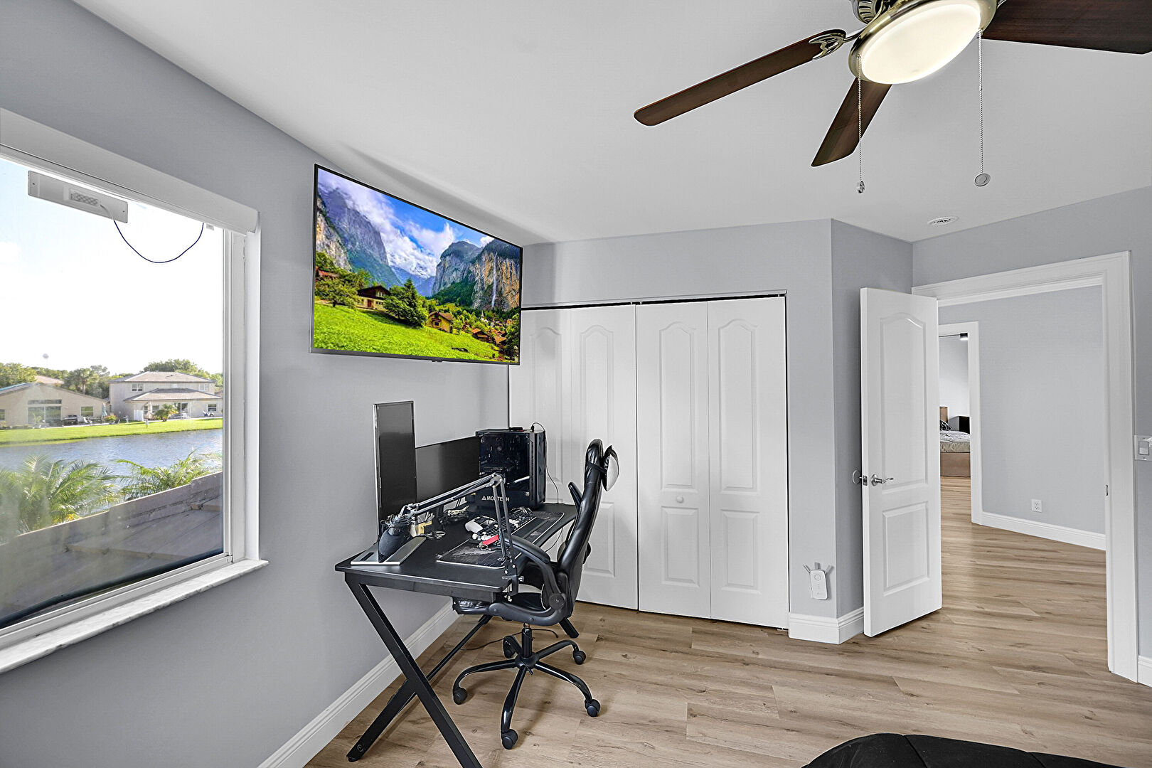 Baseboards Wall, Ceiling Fan, Drywall, Natural Light, Office Area, Vent, Wood Finish Floor, Ceiling Fan, Office Area