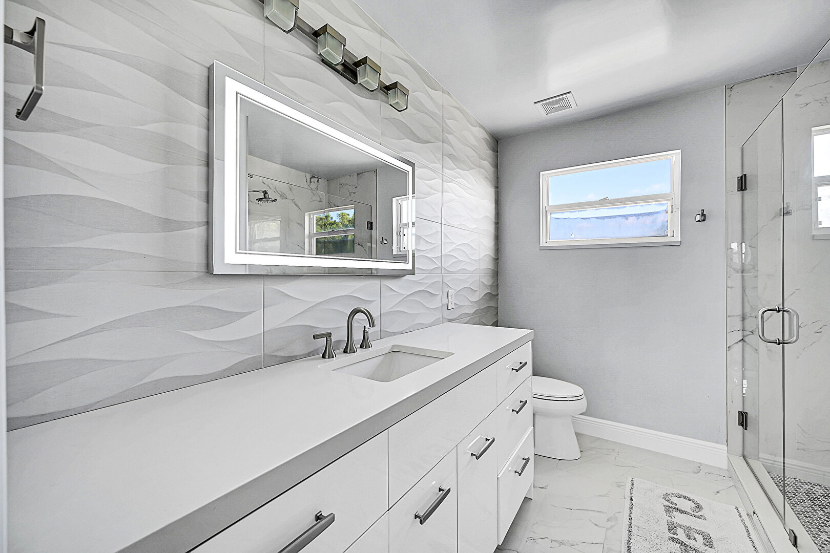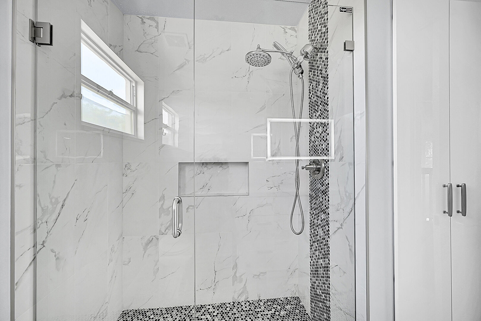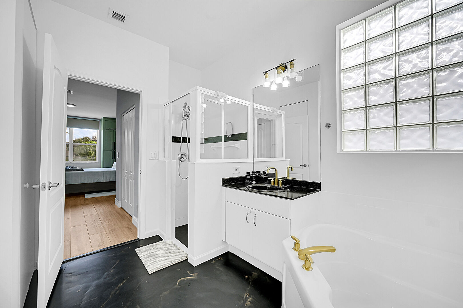 Baseboards Wall, Drywall, Full Bathroom, Natural Light, Tile Wall, Vanity, Vent, Full Bathroom, Marble Finish Floor