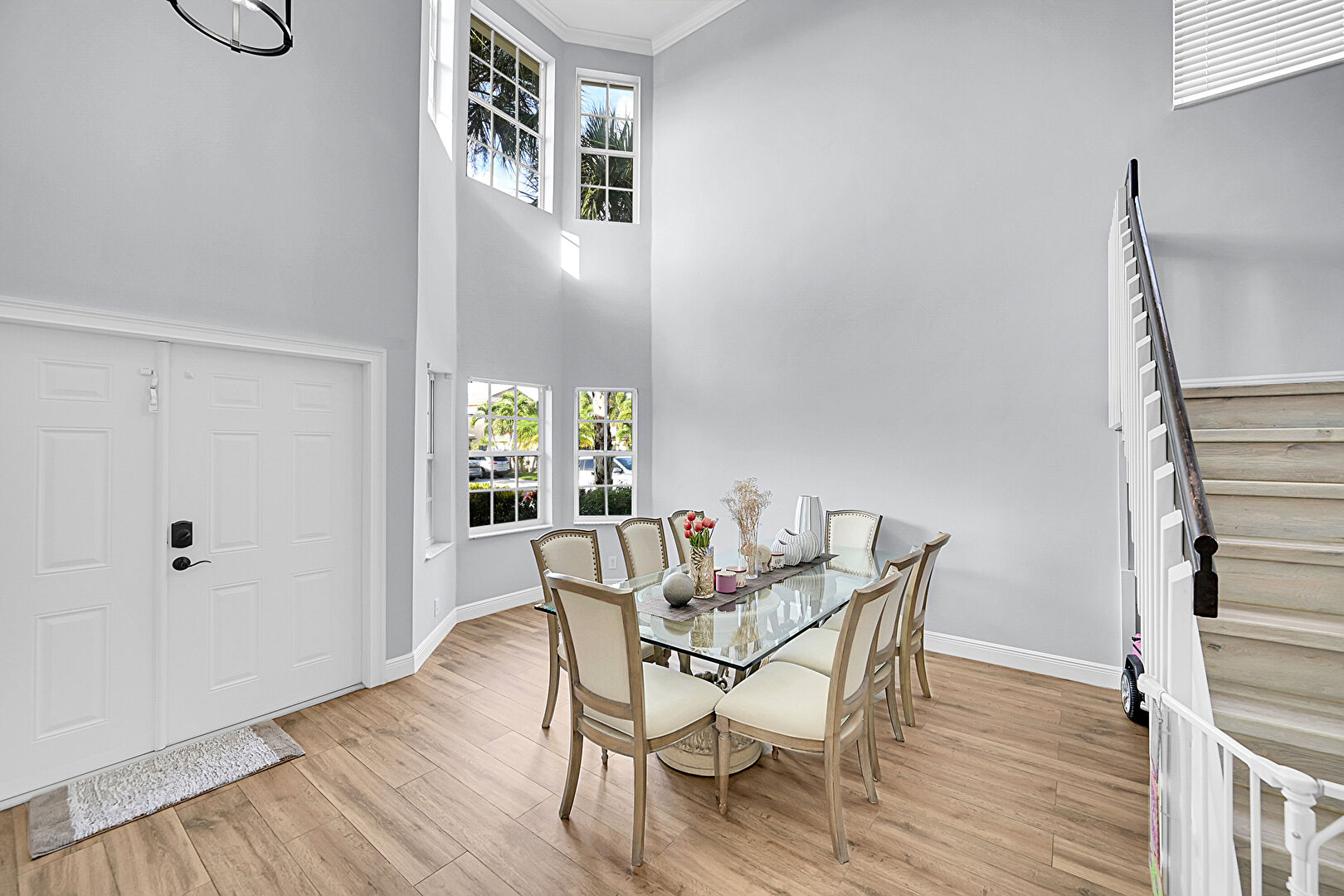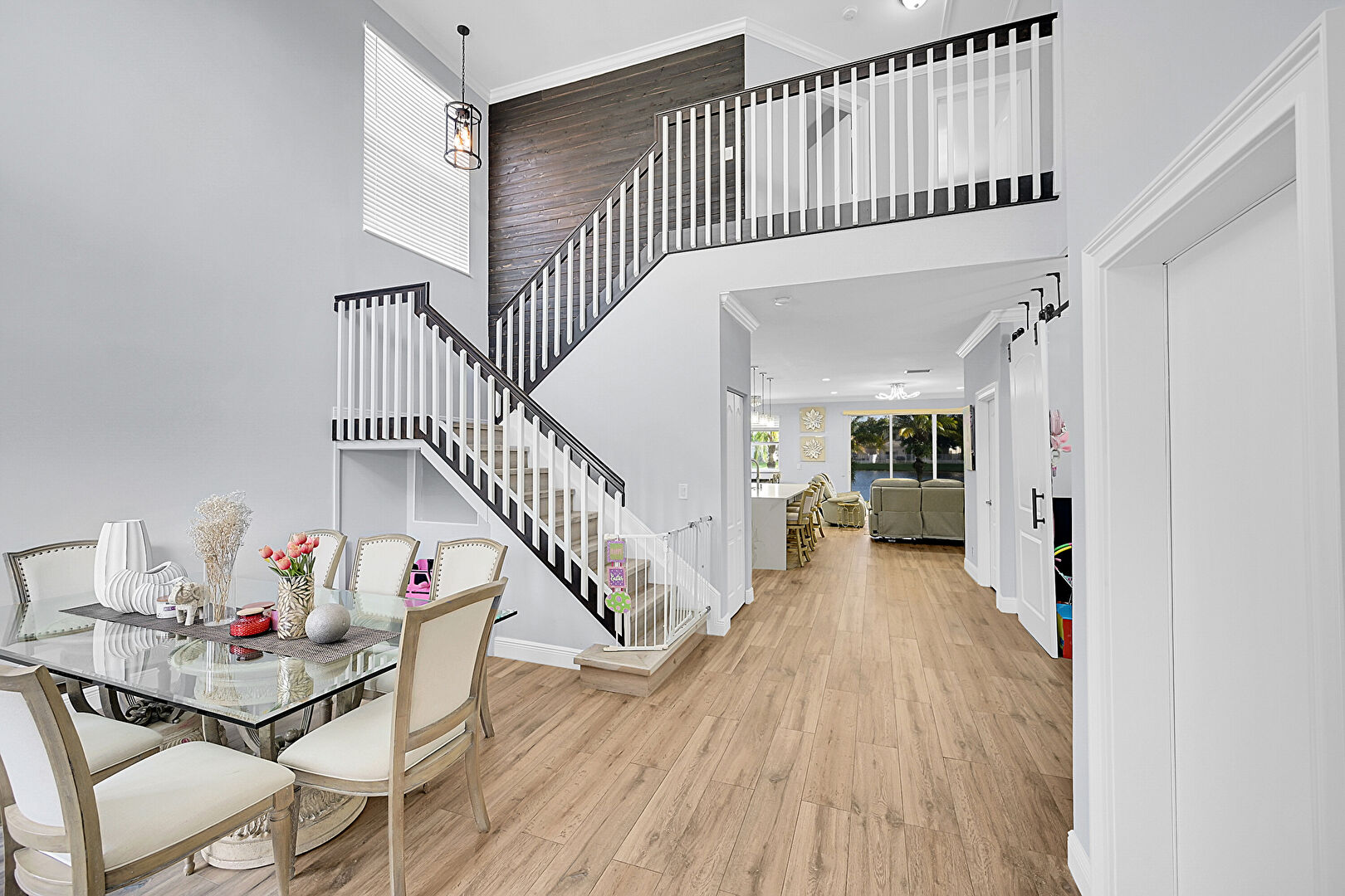 Baseboards Wall, Crown Molding, Drywall, High Ceiling, Natural Light, Stairs, Wood Finish Floor