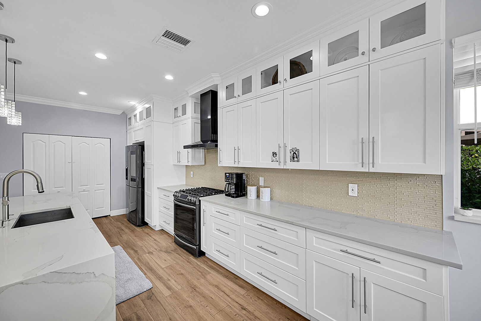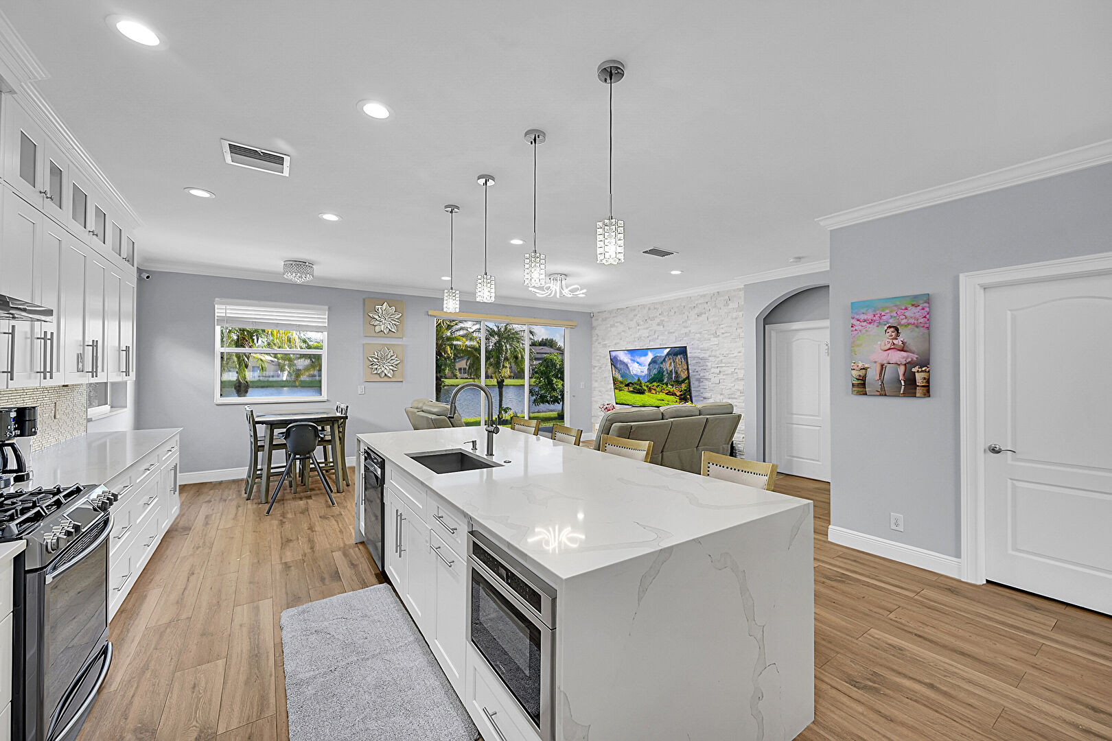 Baseboards Wall, Crown Molding, Crown Molding Cabinets, Drywall, Glass Insert Cabinets, Kitchen Bar, Kitchen Island, Natural Light, One Wall Kitchen, Opens To Living Area, Pendant Lighting, Recessed Lighting, Shaker Cabinets, Stone Countertops, Vent, Water View, Waterfront, Wood Finish Floor, Arched Walkways, Baseboards Wall, Kitchen Island, Stone Countertops