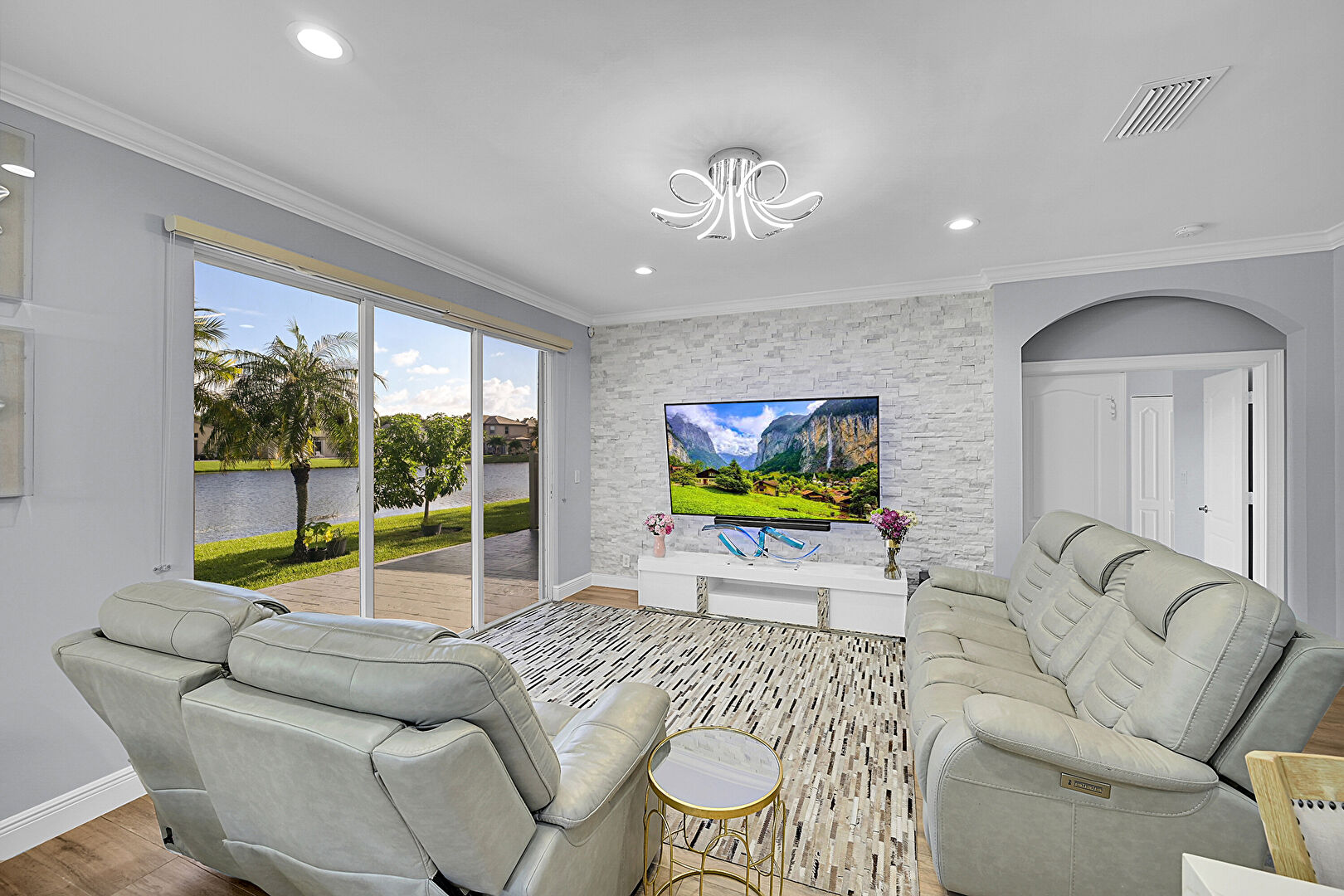 Baseboards Wall, Crown Molding, Natural Light, Recessed Lighting, Water View, Waterfront, Wood Finish Floor, Drywall