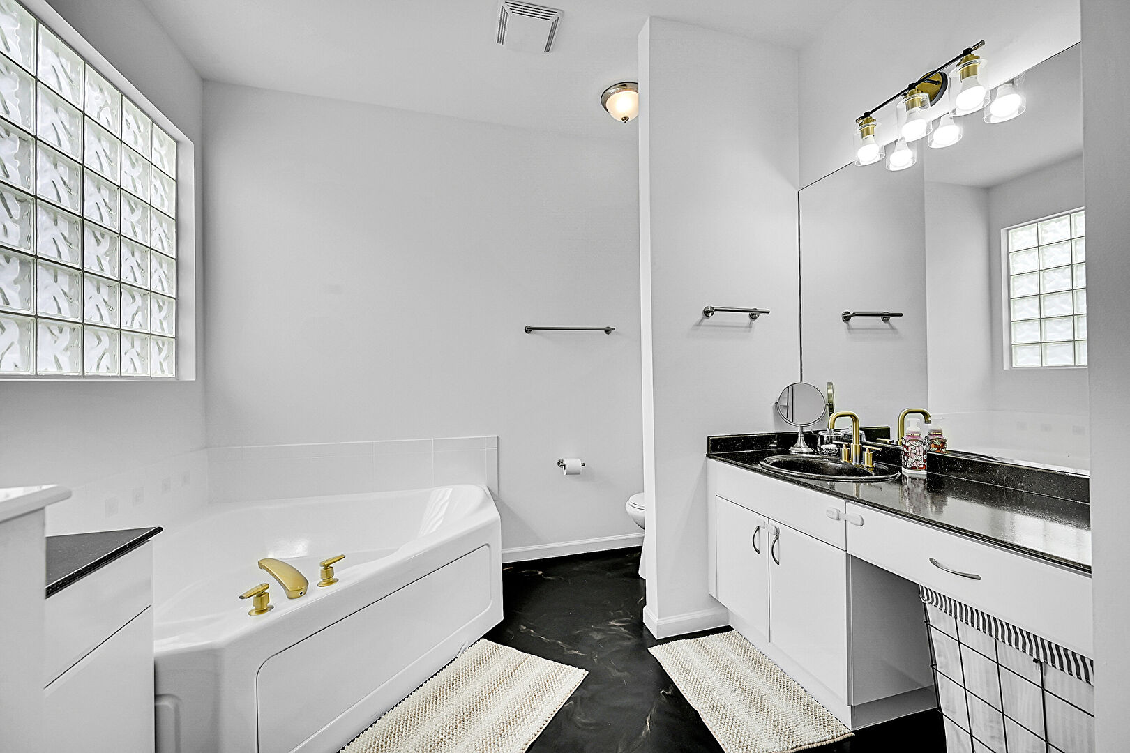 Baseboards Wall, Concrete Floor, Drywall, Full Bathroom, Natural Light, Vanity, Vent, Drywall, Ensuite Bathroom