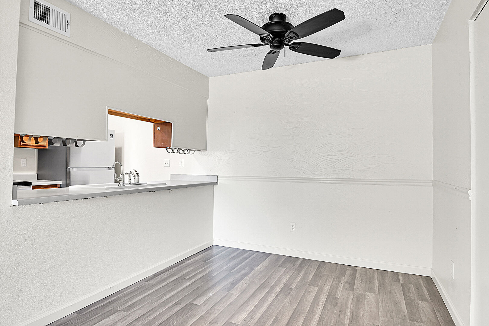 Baseboards Wall, Ceiling Fan, Drywall, Medium Brown Cabinets, Natural Light, Pass Through Window, Shaker Cabinets, Visible Hinge Cabinets, Wood Finish Floor, Textured Ceiling, Visible Hinge Cabinets