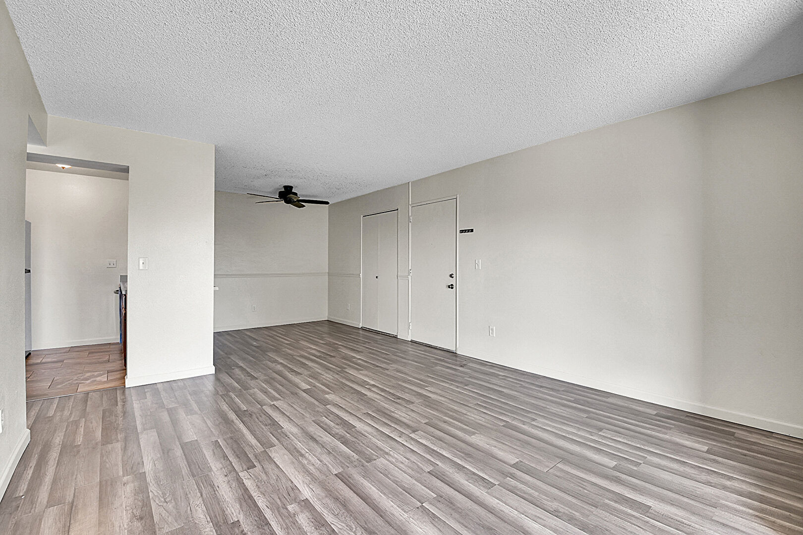 Baseboards Wall, Ceiling Fan, Drywall, Vent, Wood Finish Floor, Textured Ceiling