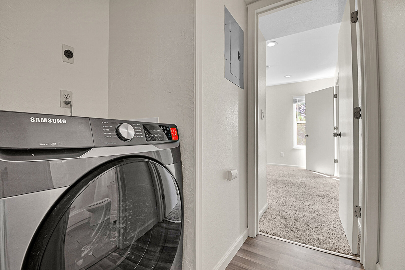 Baseboards Wall, Carpet, Electric Dryer Hookup, Electric Panel, Laundry, Natural Light, Recessed Lighting, Textured Wall, Washer Dryer, Wood Finish Floor