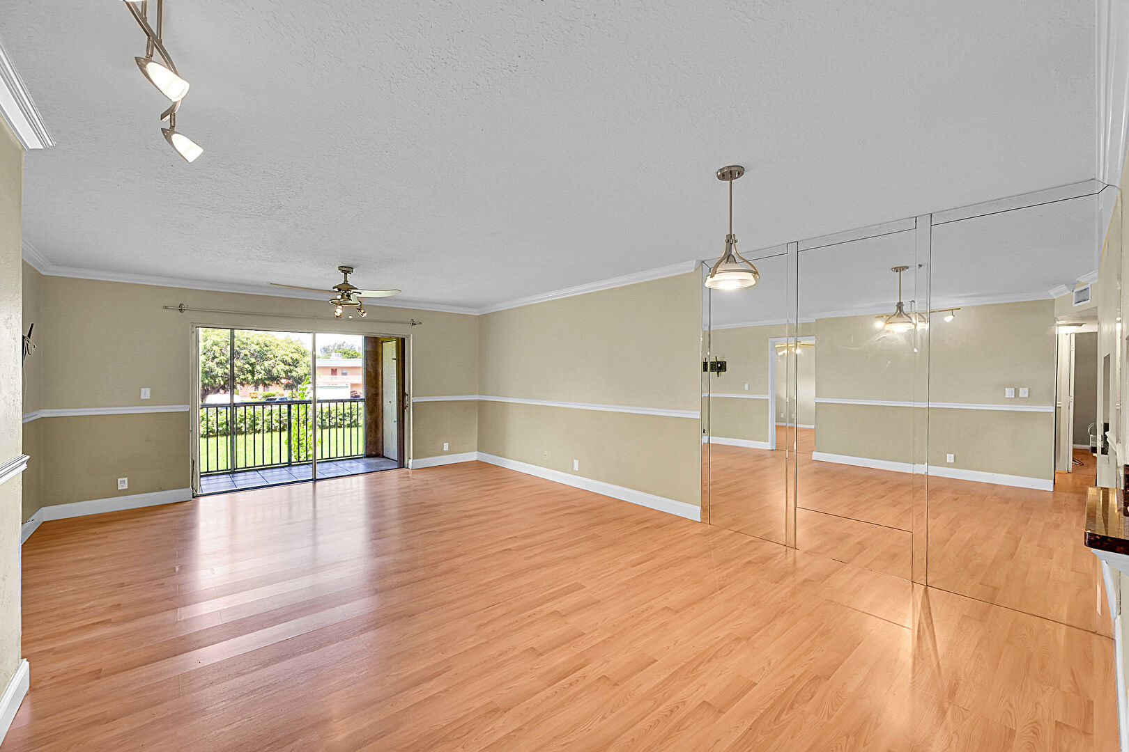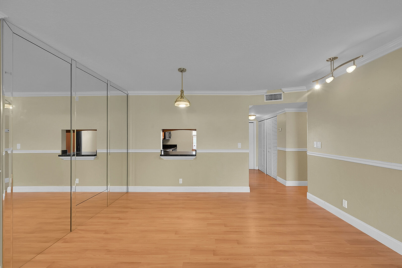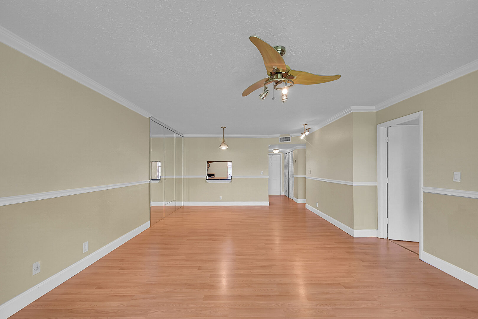Baseboards Wall, Ceiling Fan, Crown Molding, Drywall, Natural Light, Textured Ceiling, Track Lighting, Vent, Wood Finish Floor, Ceiling Fan, Crown Molding, Track Lighting, Vent