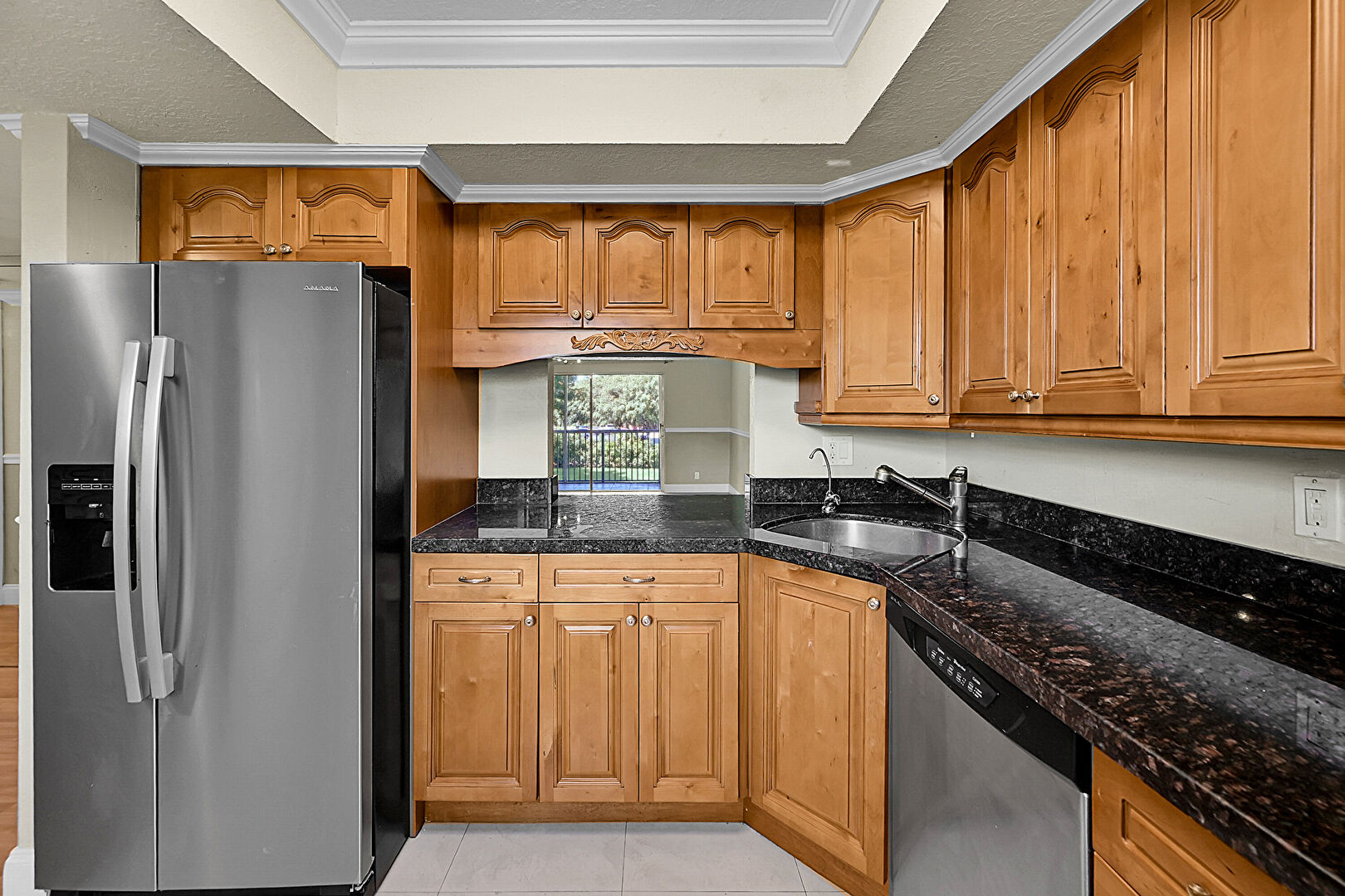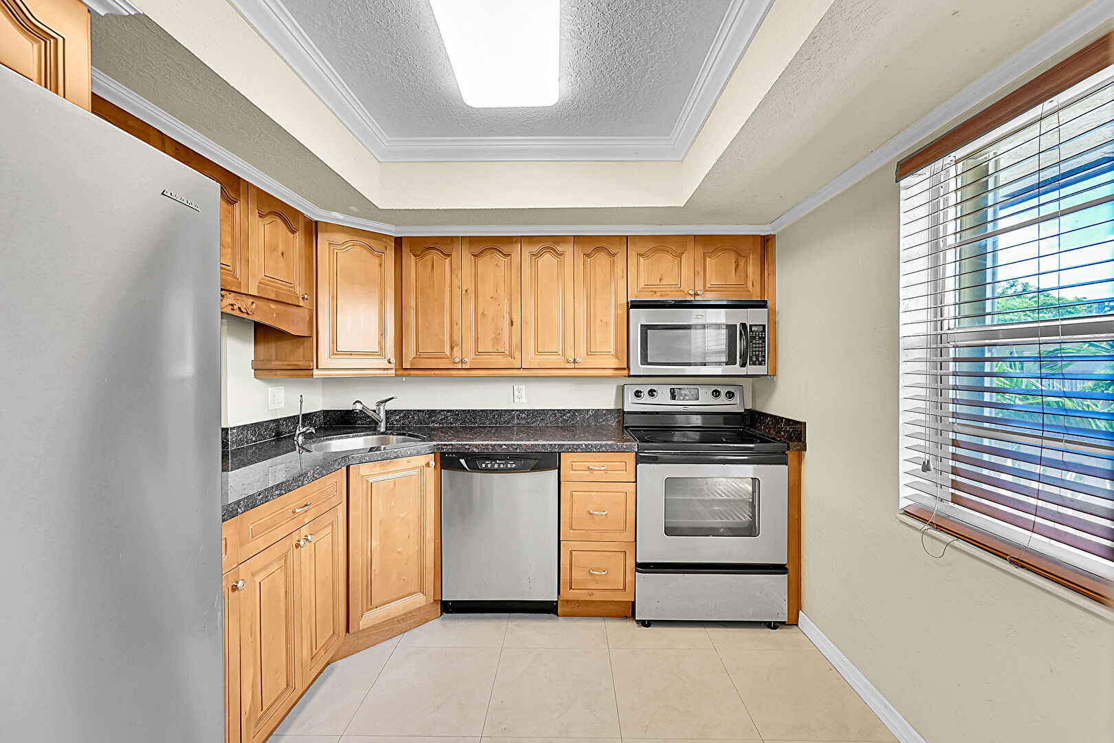 Arched Cabinets, Baseboards Wall, Crown Molding, Drywall, Medium Brown Cabinets, Natural Light, Raised Cabinets, Stone Countertops, Textured Ceiling, Textured Wall, Tile Floor, Tray Ceiling, Raised Cabinets, Stone Countertops, Textured Ceiling