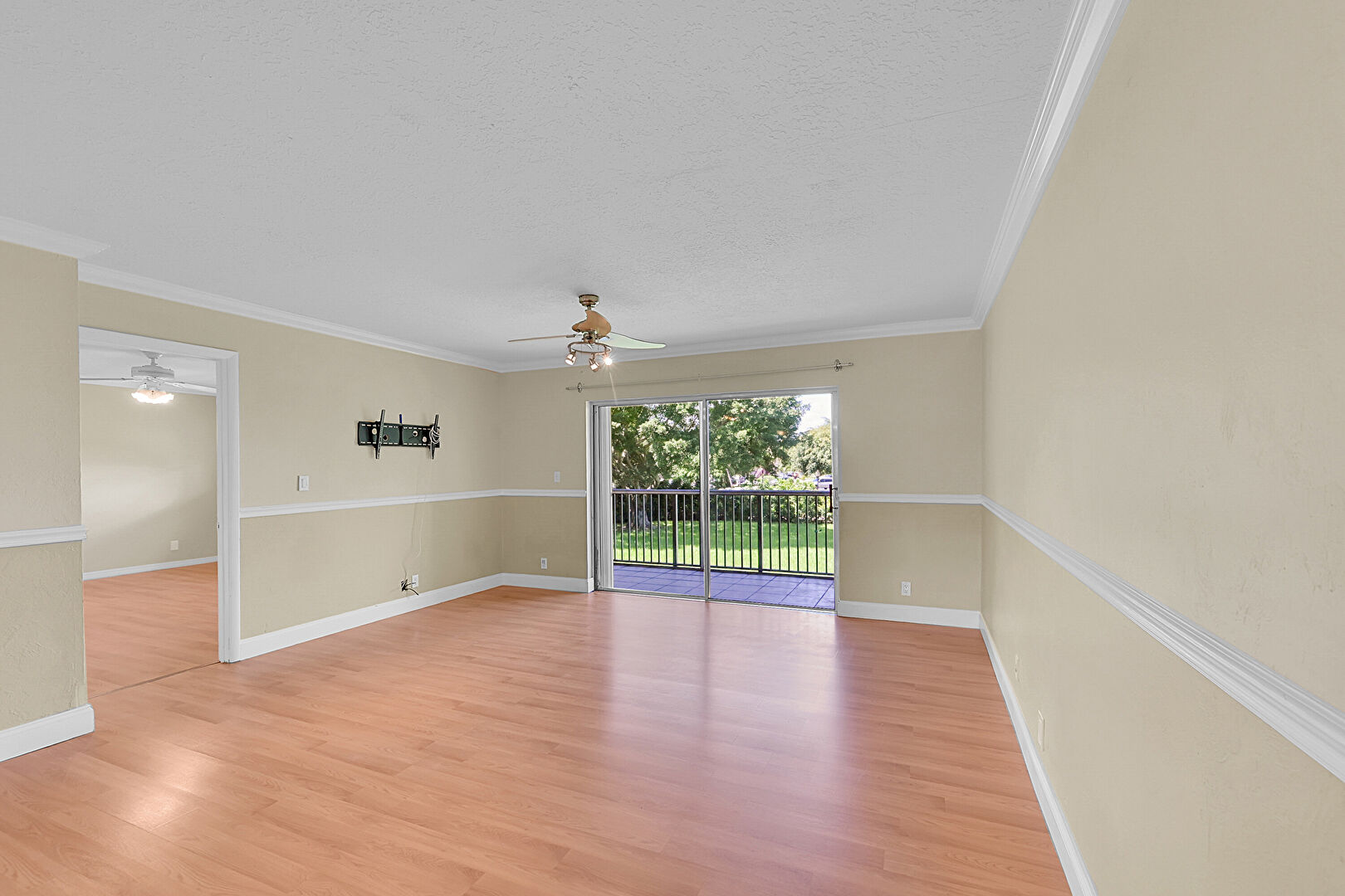 Baseboards Wall, Ceiling Fan, Crown Molding, Drywall, Natural Light, Textured Ceiling, Wood Finish Floor, Ceiling Fan, Natural Light