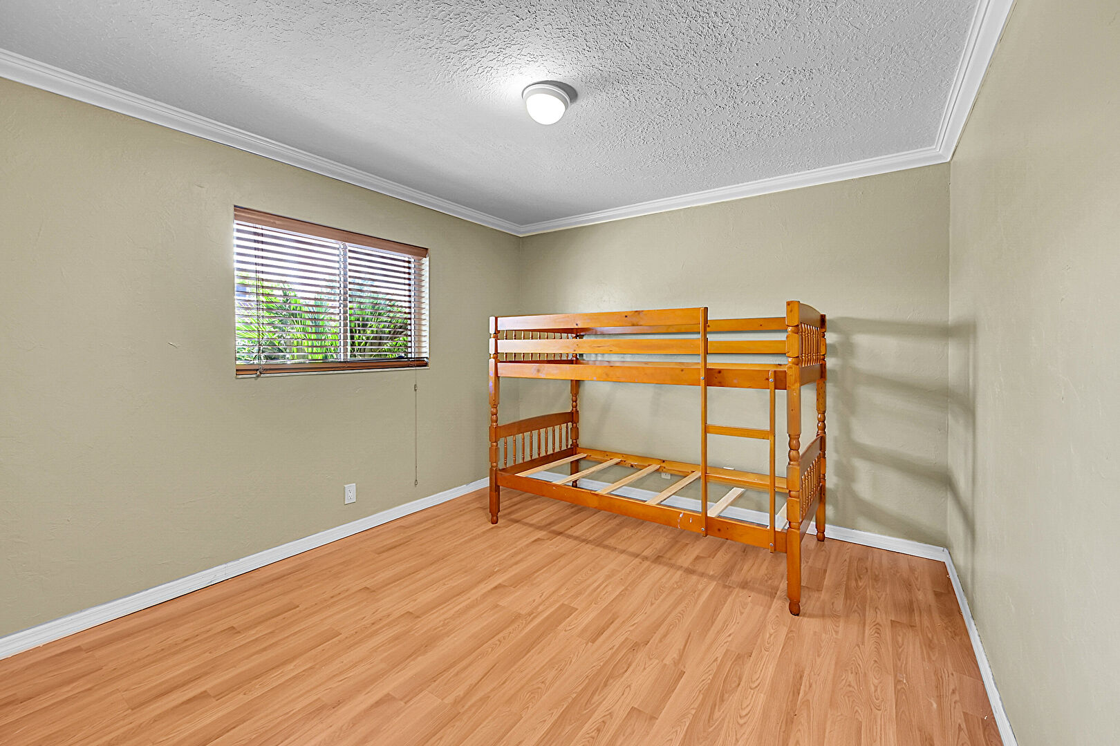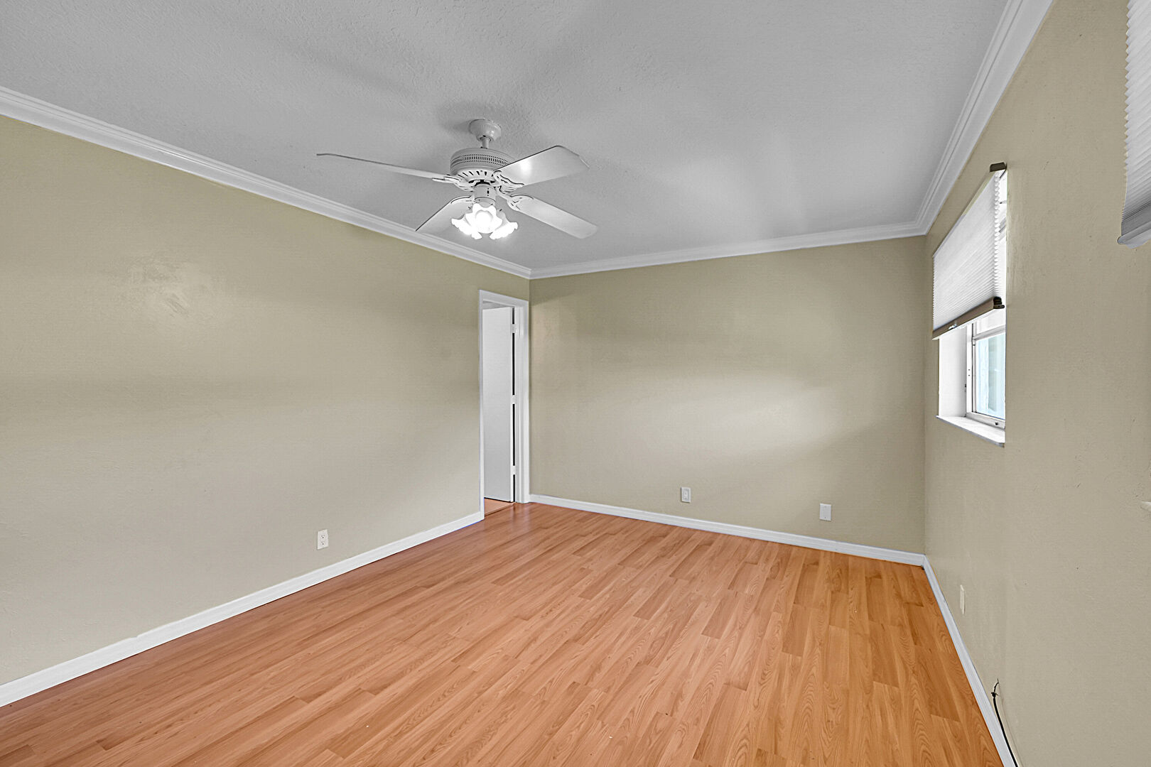 Baseboards Wall, Crown Molding, Drywall, Natural Light, Textured Ceiling, Wood Finish Floor, Ceiling Fan