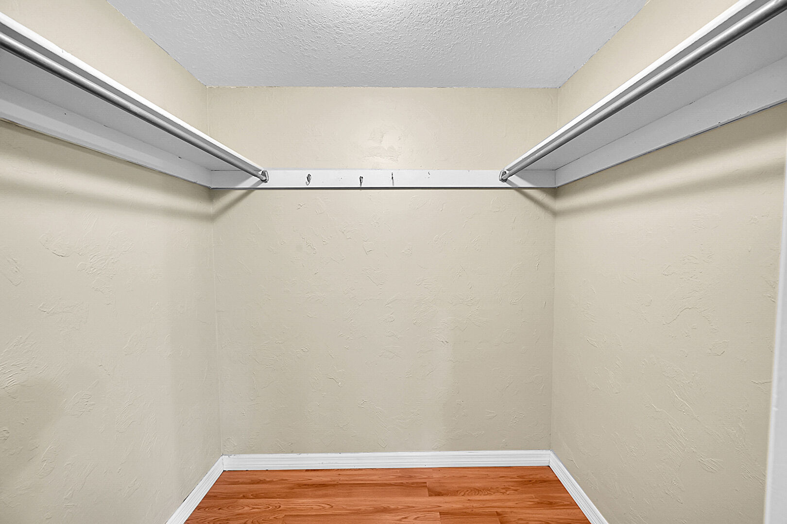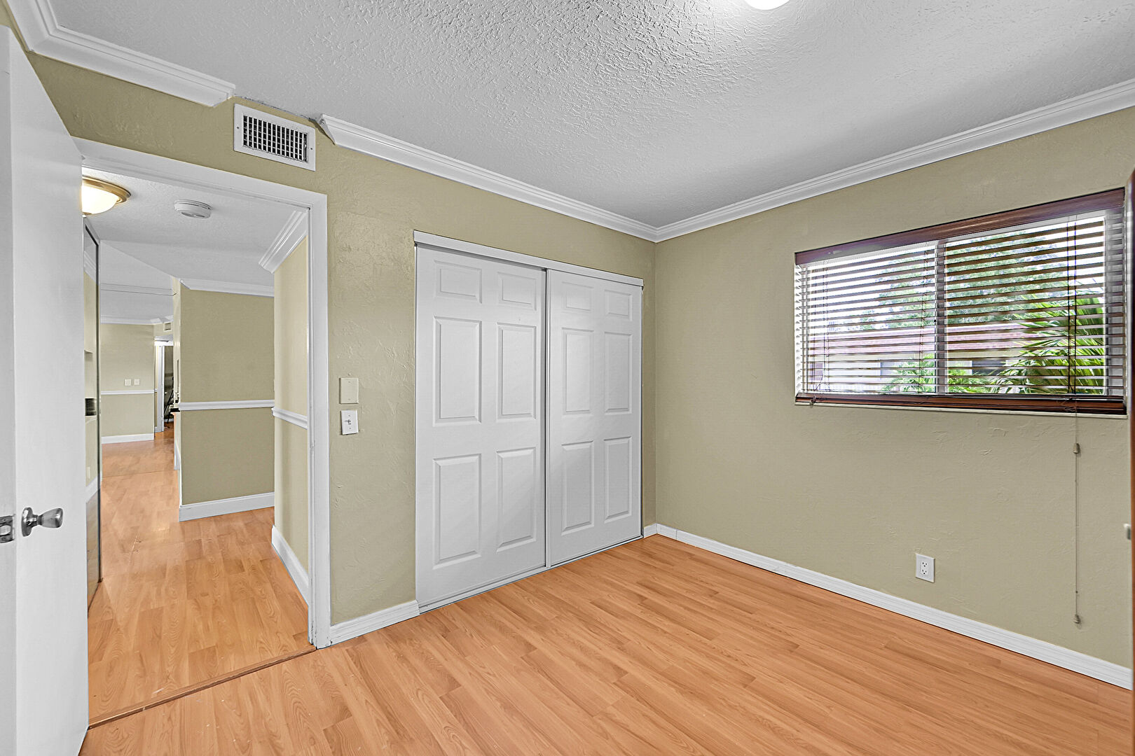Closet, Crown Molding, Drywall, Natural Light, Textured Ceiling, Vent, Wood Finish Floor, Baseboards Wall