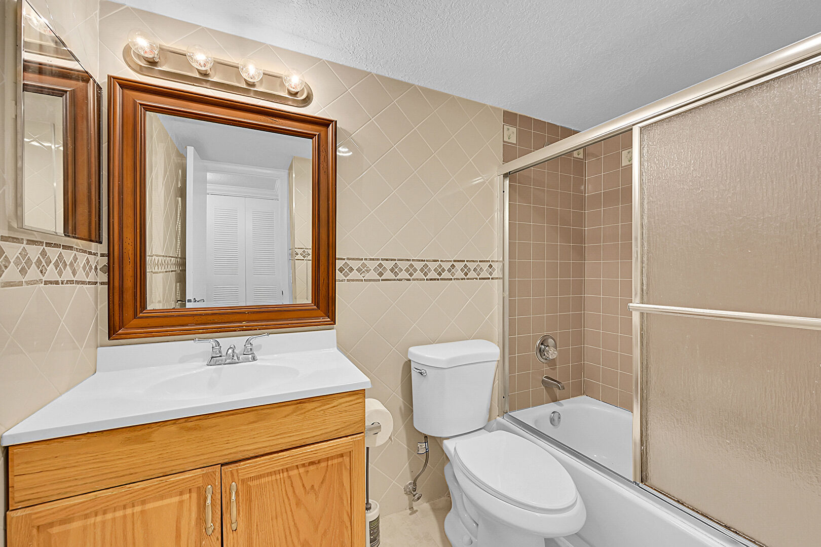 Full Bathroom, Textured Ceiling, Tile Wall, Vanity, Combined Bath Shower