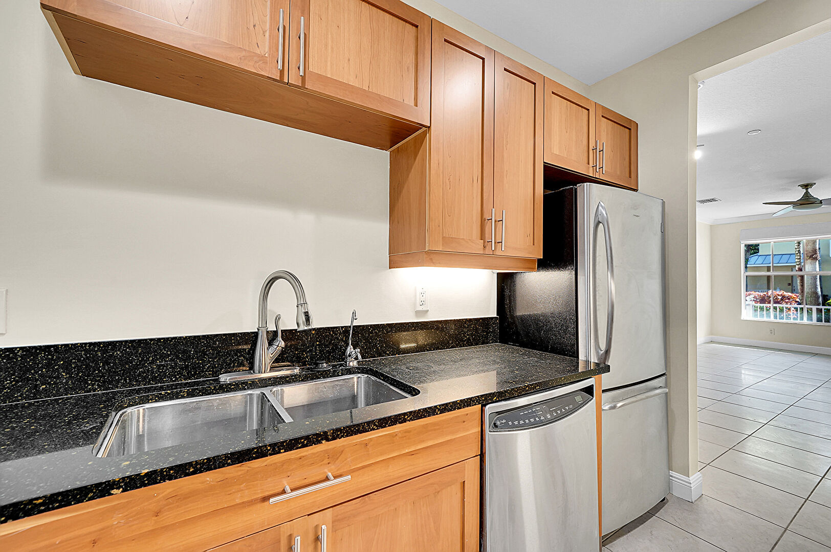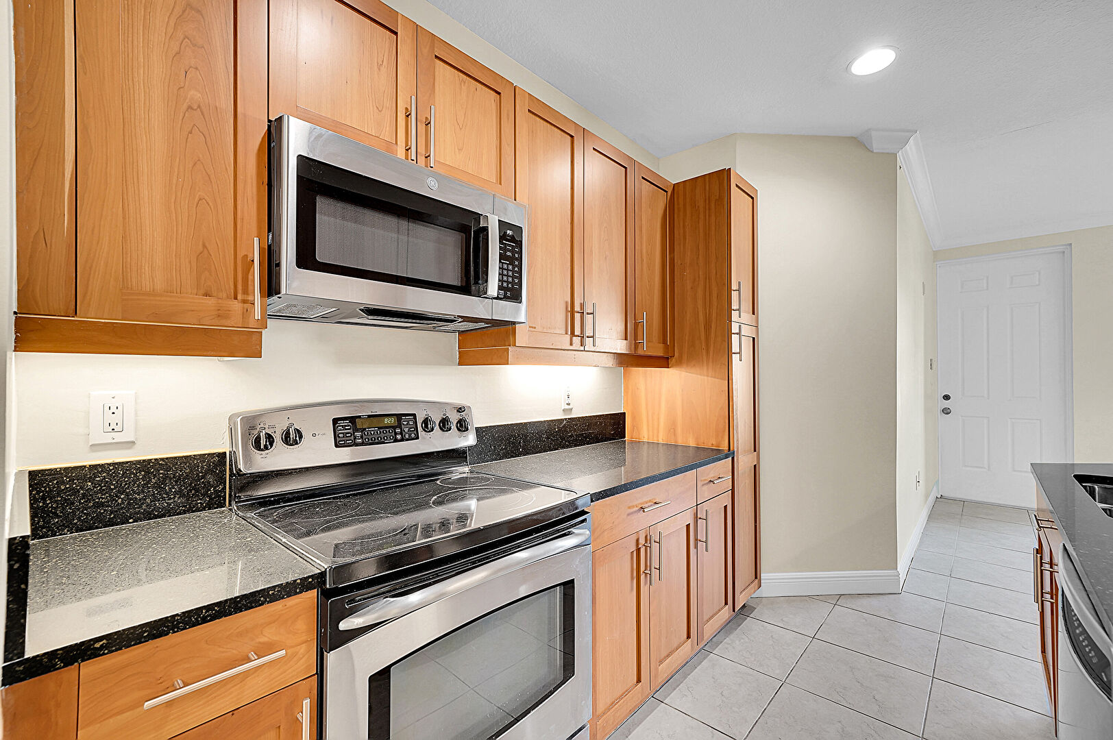 Baseboards Wall, Ceiling Fan, Crown Molding, Drywall, Medium Brown Cabinets, Natural Light, Recessed Lighting, Shaker Cabinets, Stone Countertops, Tile Floor, Shaker Cabinets, Tile Floor
