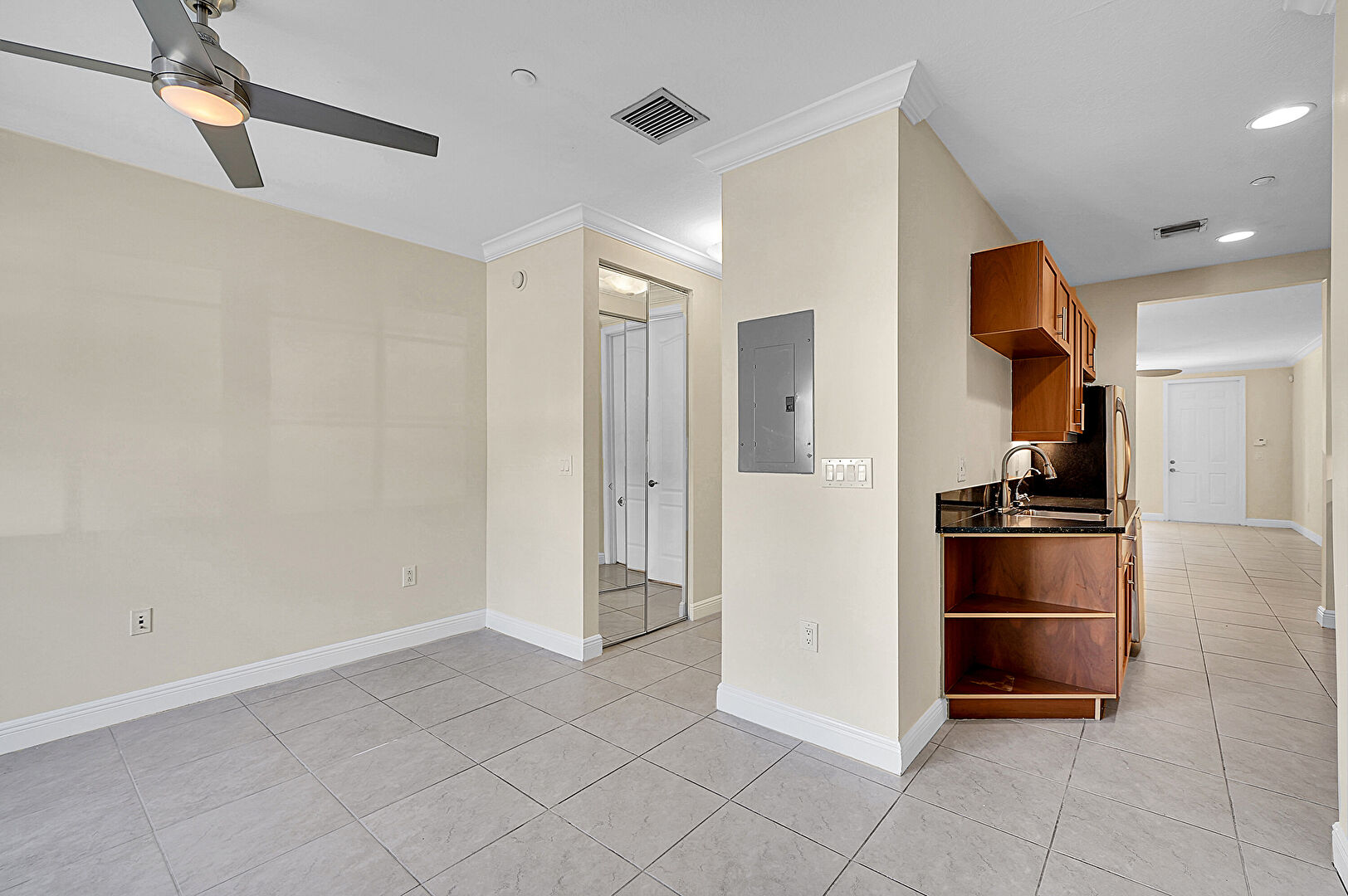 Baseboards Wall, Ceiling Fan, Crown Molding, Drywall, Electric Panel, Medium Brown Cabinets, Natural Light, Open Shelves, Recessed Lighting, Tile Floor, Vent, Baseboards Wall, Ceiling Fan, Natural Light, Tile Floor