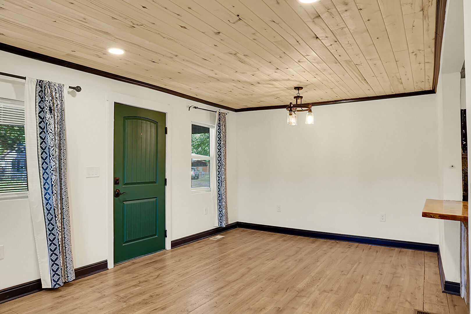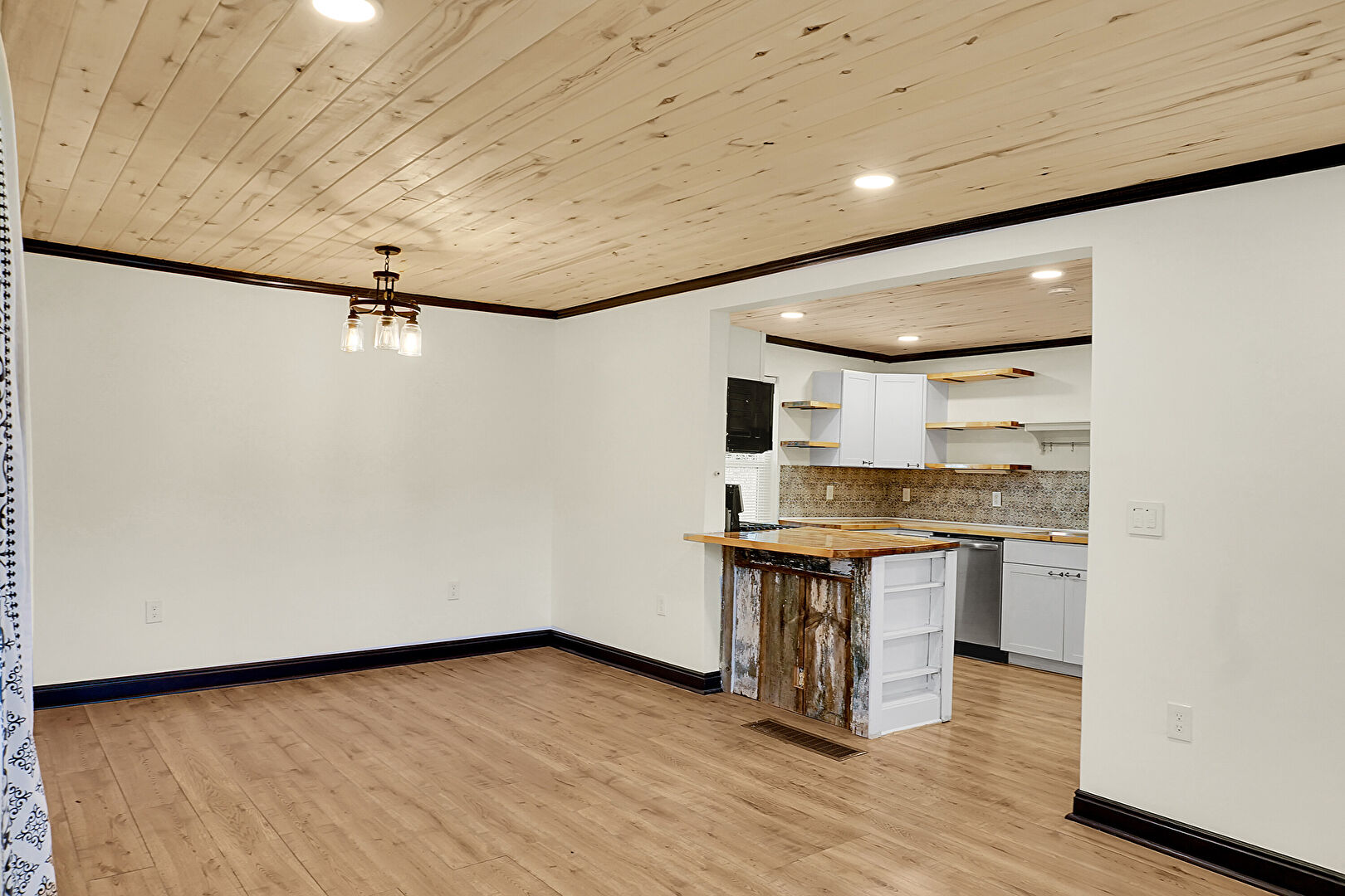 Baseboards Wall, Butcher Block Countertops, Crown Molding, Drywall, Kitchen Peninsula, Natural Light, Notable Chandelier, Open Shelves, Pendant Lighting, Recessed Lighting, Shaker Cabinets, Vent, Wall Furnace, Wood Ceiling, Wood Finish Floor, Notable Chandelier, Wood Finish Floor