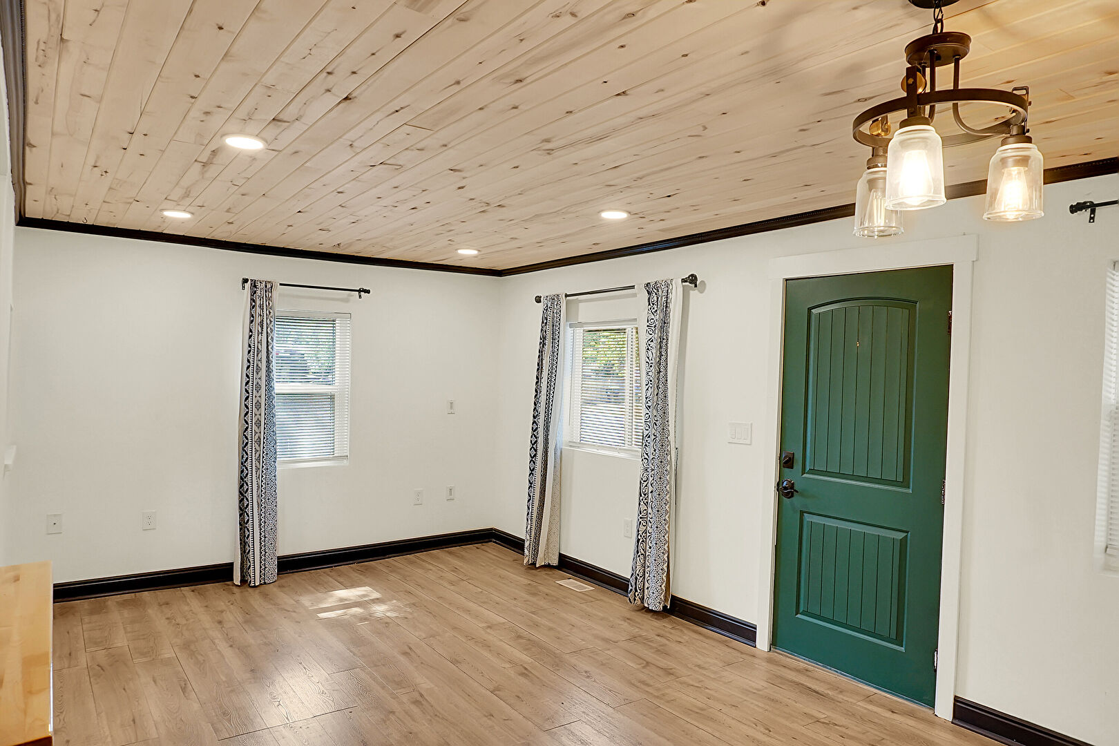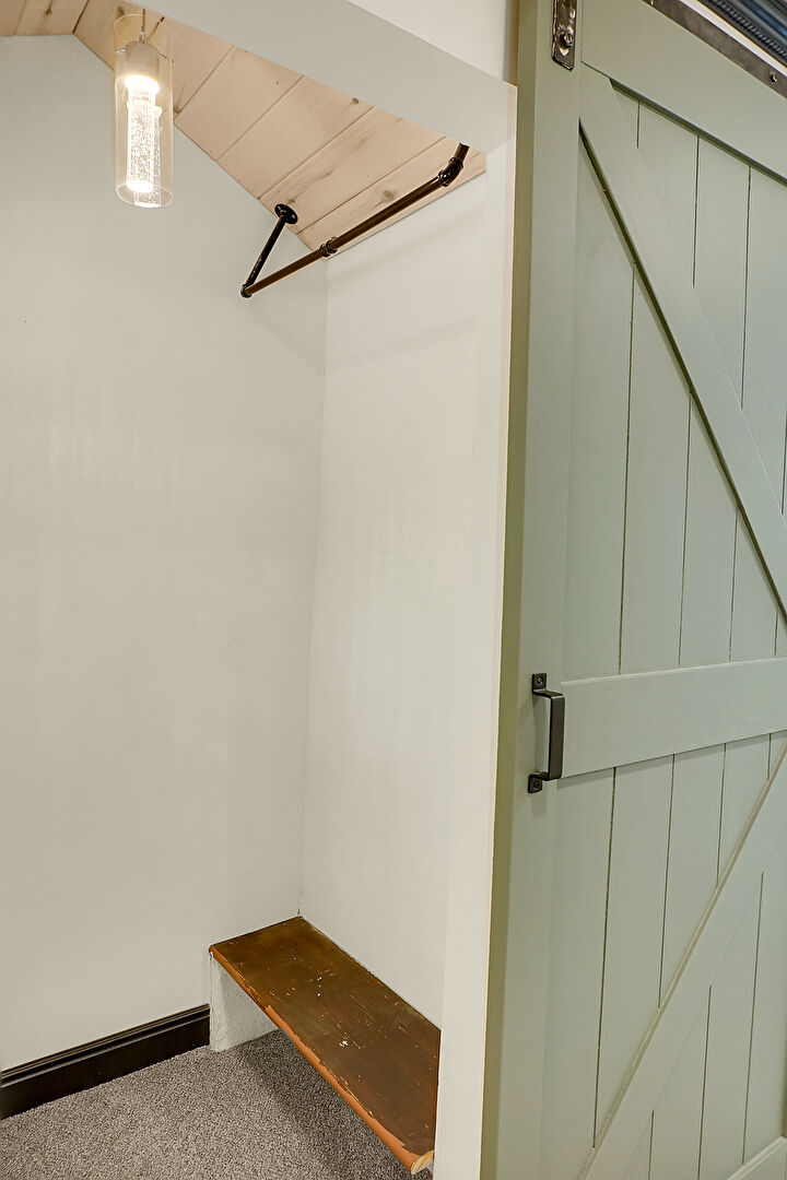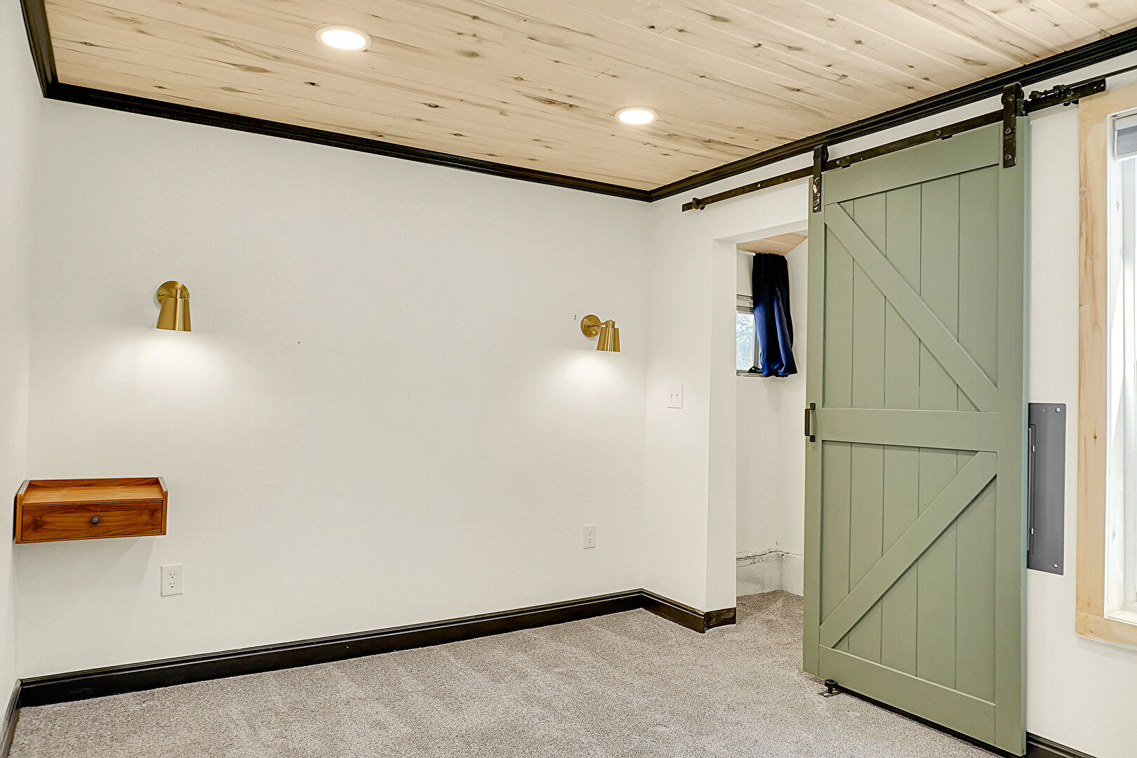 Barn Door, Baseboards Wall, Carpet, Crown Molding, Drywall, Natural Light, Recessed Lighting, Smoke Carbon Monoxide Detector, Wood Ceiling, Baseboards Wall, Drywall