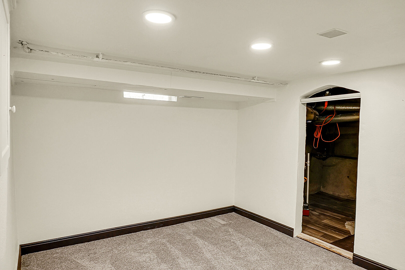 Baseboards Wall, Basement, Carpet, Drywall, Recessed Lighting, Vent, Basement, Stairs