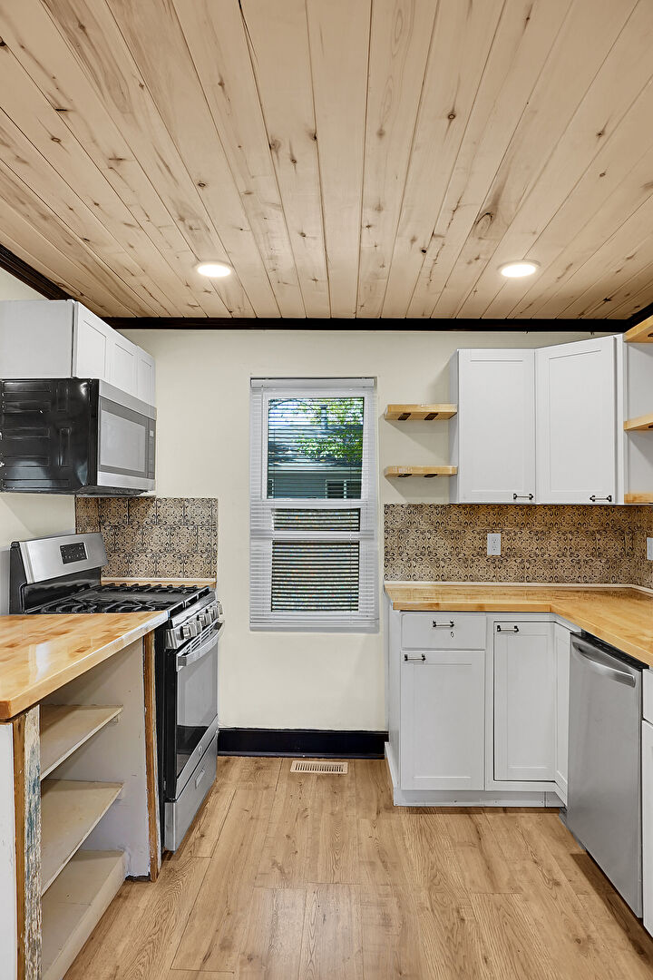 Baseboards Wall, Butcher Block Countertops, Crown Molding, Drywall, Natural Light, Notable Chandelier, Open Shelves, Pendant Lighting, Recessed Lighting, Shaker Cabinets, Vent, Wood Ceiling, Wood Finish Floor, Natural Light, Open Shelves, Recessed Lighting, Shaker Cabinets