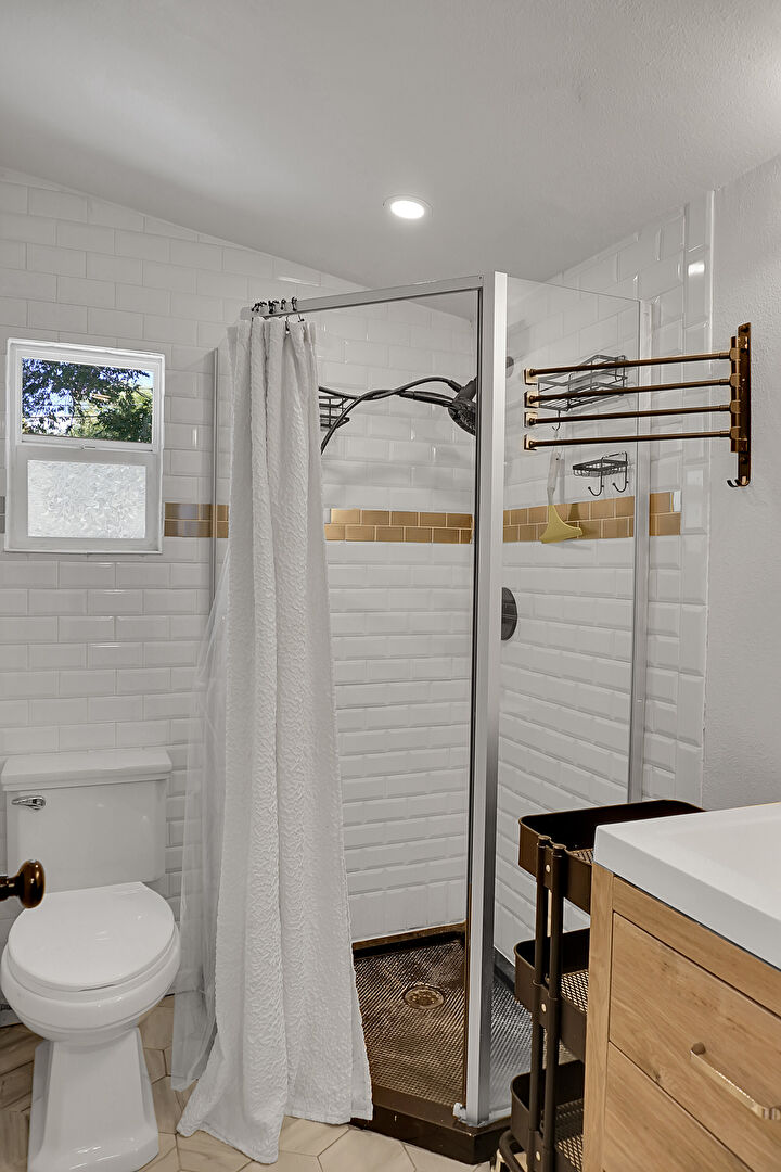 Baseboards Wall, Drywall, Laundry, Natural Light, Recessed Lighting, Tile Floor, Tile Wall, Vanity, Full Bathroom, Wood Finish Floor