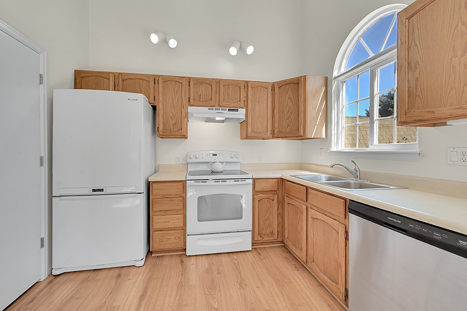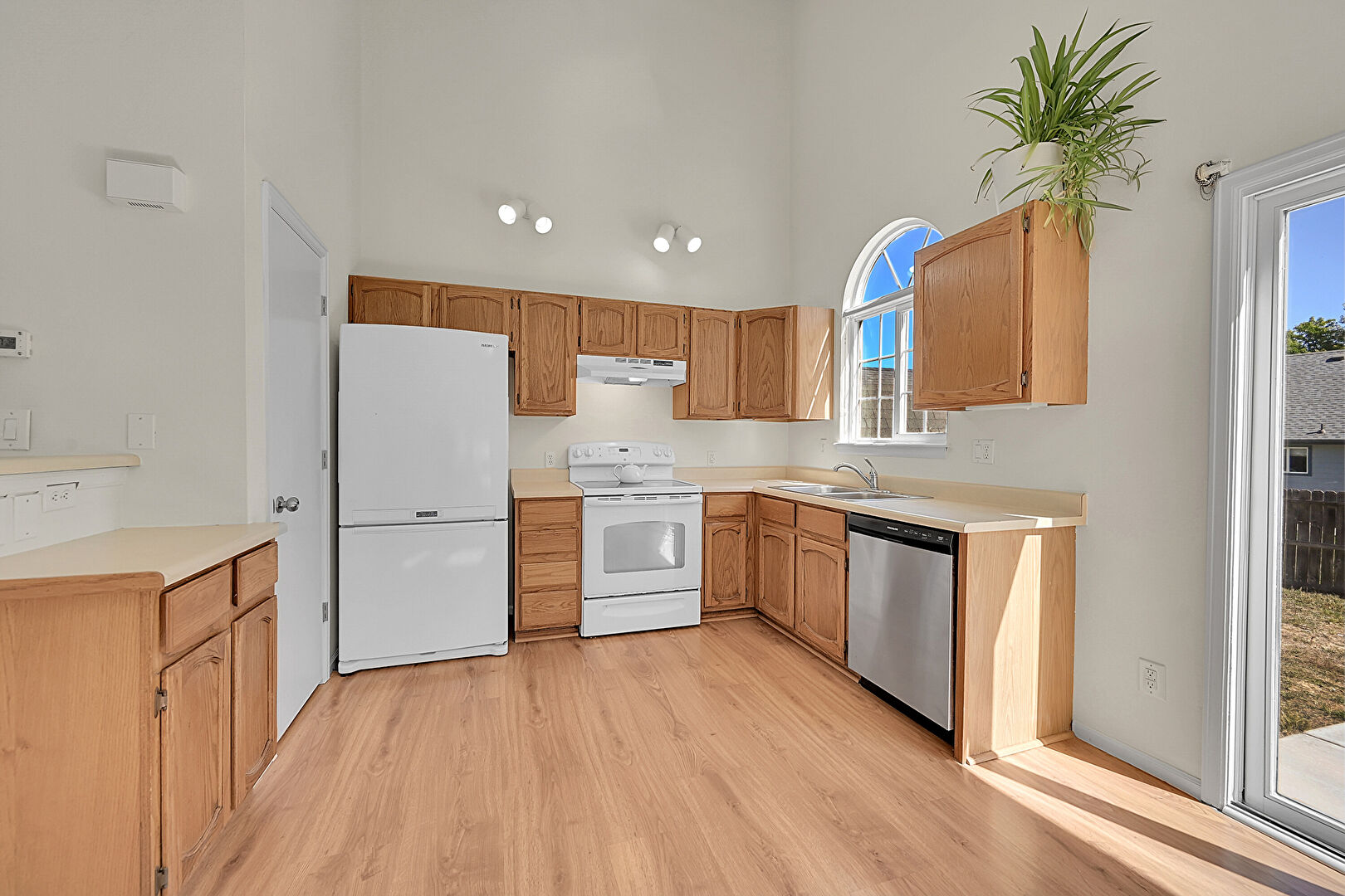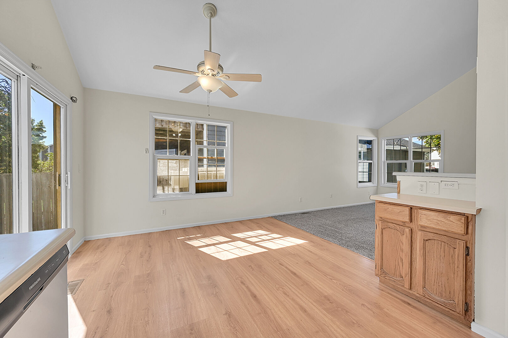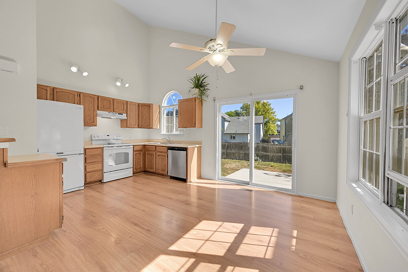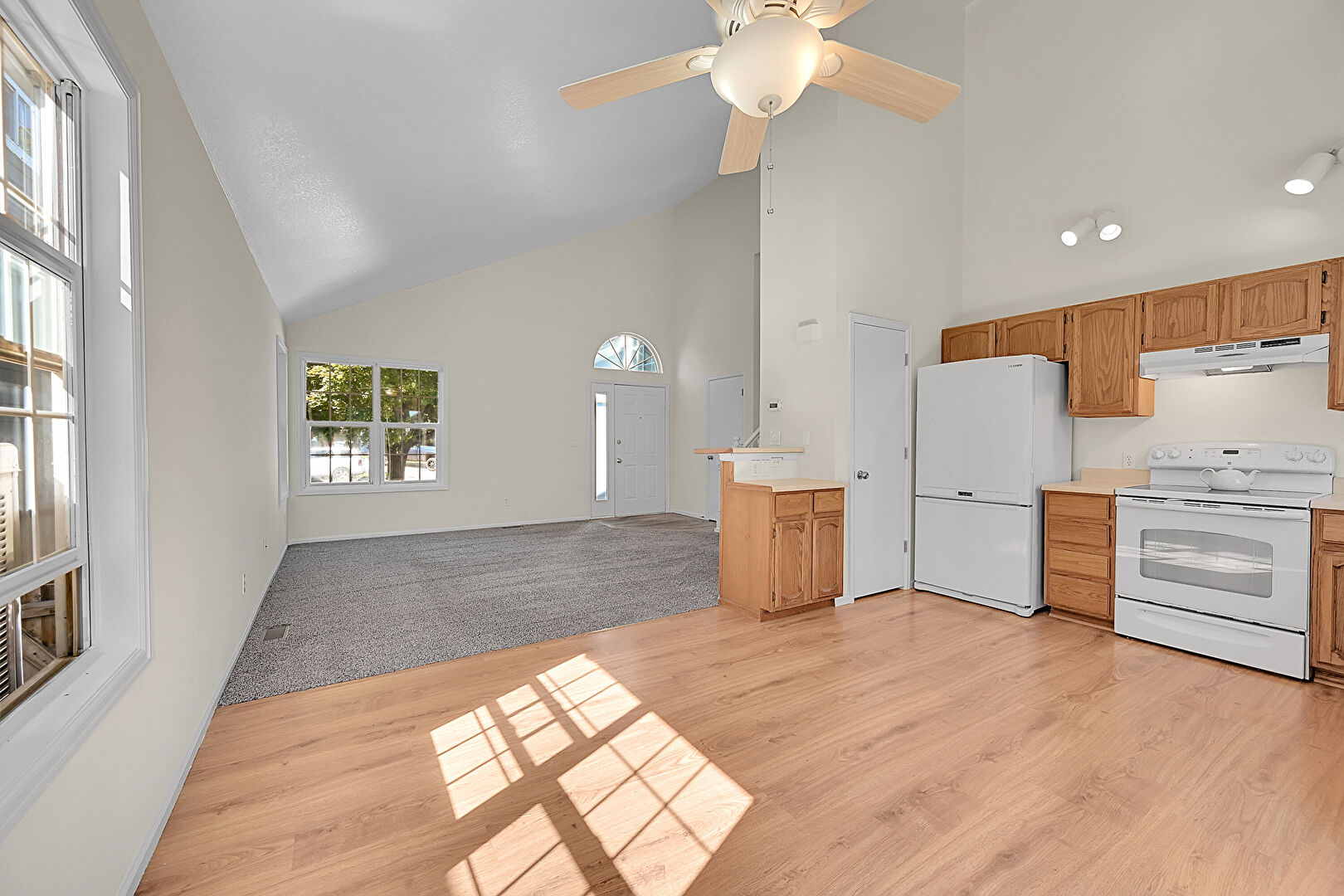 Arched Cabinets, Baseboards Wall, Carpet, Ceiling Fan, Drywall, High Ceiling, Kitchen Peninsula, Medium Brown Cabinets, Natural Light, Opens To Living Area, Shaker Cabinets, U Shaped Kitchen, Vaulted Ceiling, Visible Hinge Cabinets, Wood Finish Floor, Ceiling Fan, High Ceiling, Shaker Cabinets, Visible Hinge Cabinets