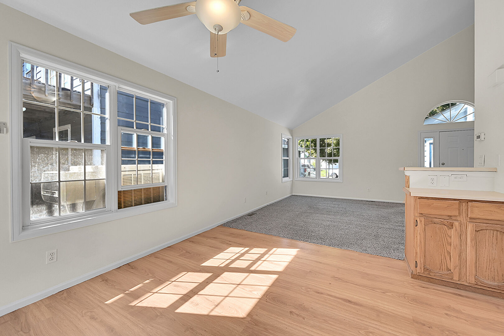 Baseboards Wall, Carpet, Ceiling Fan, Drywall, High Ceiling, Natural Light, Vaulted Ceiling, Wood Finish Floor, High Ceiling, Natural Light