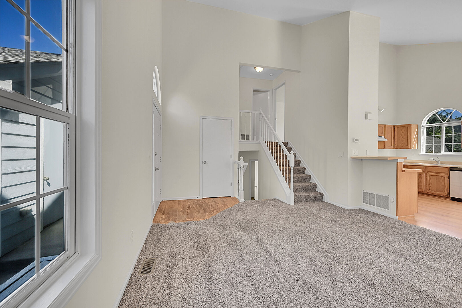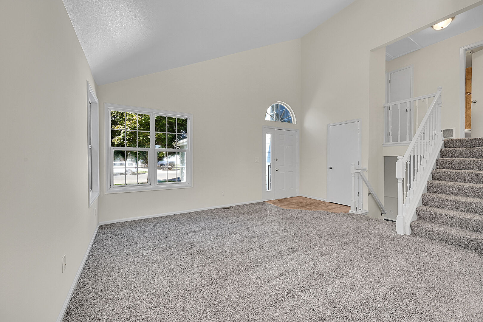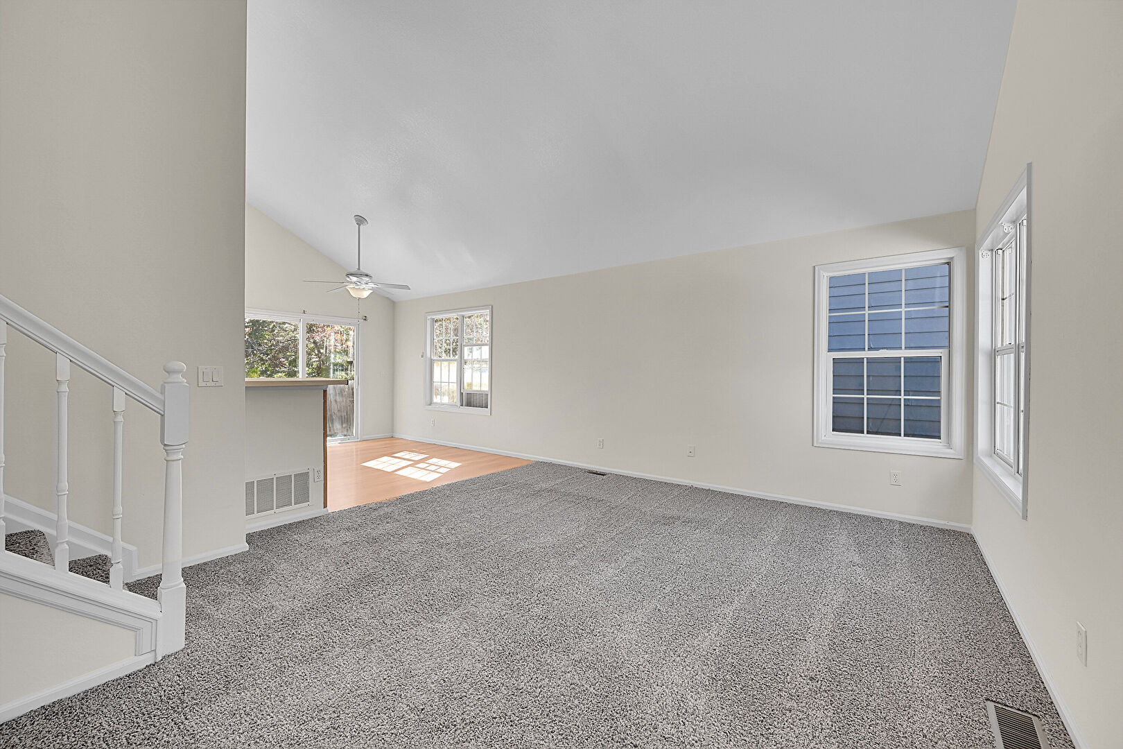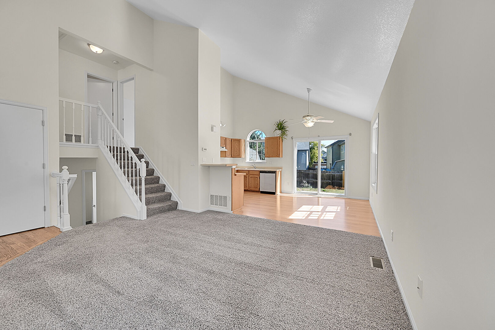 Baseboards Wall, Carpet, Ceiling Fan, Drywall, High Ceiling, Natural Light, Stairs, Vaulted Ceiling, Vent, Wood Finish Floor, Baseboards Wall, High Ceiling, Vaulted Ceiling, Wood Finish Floor