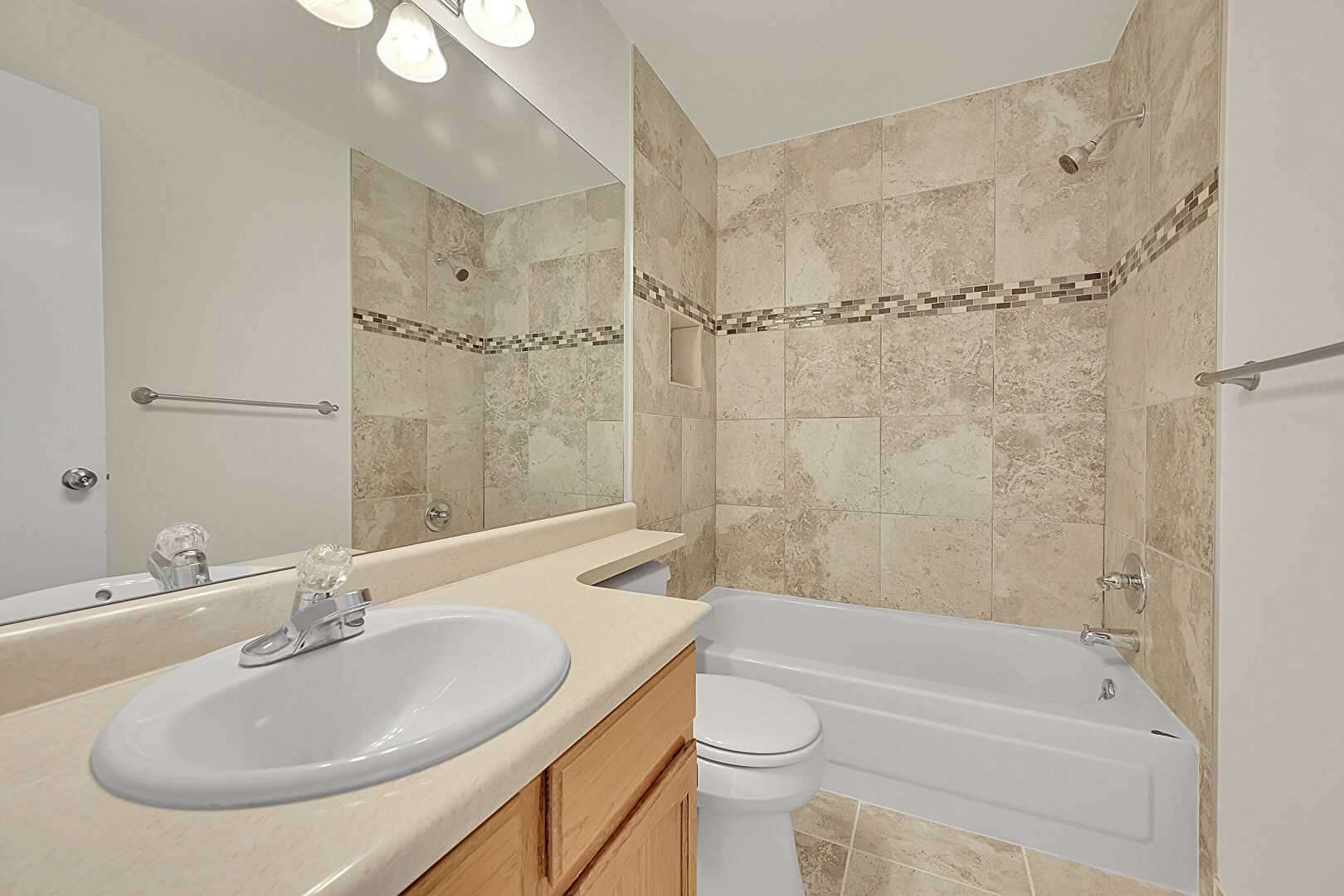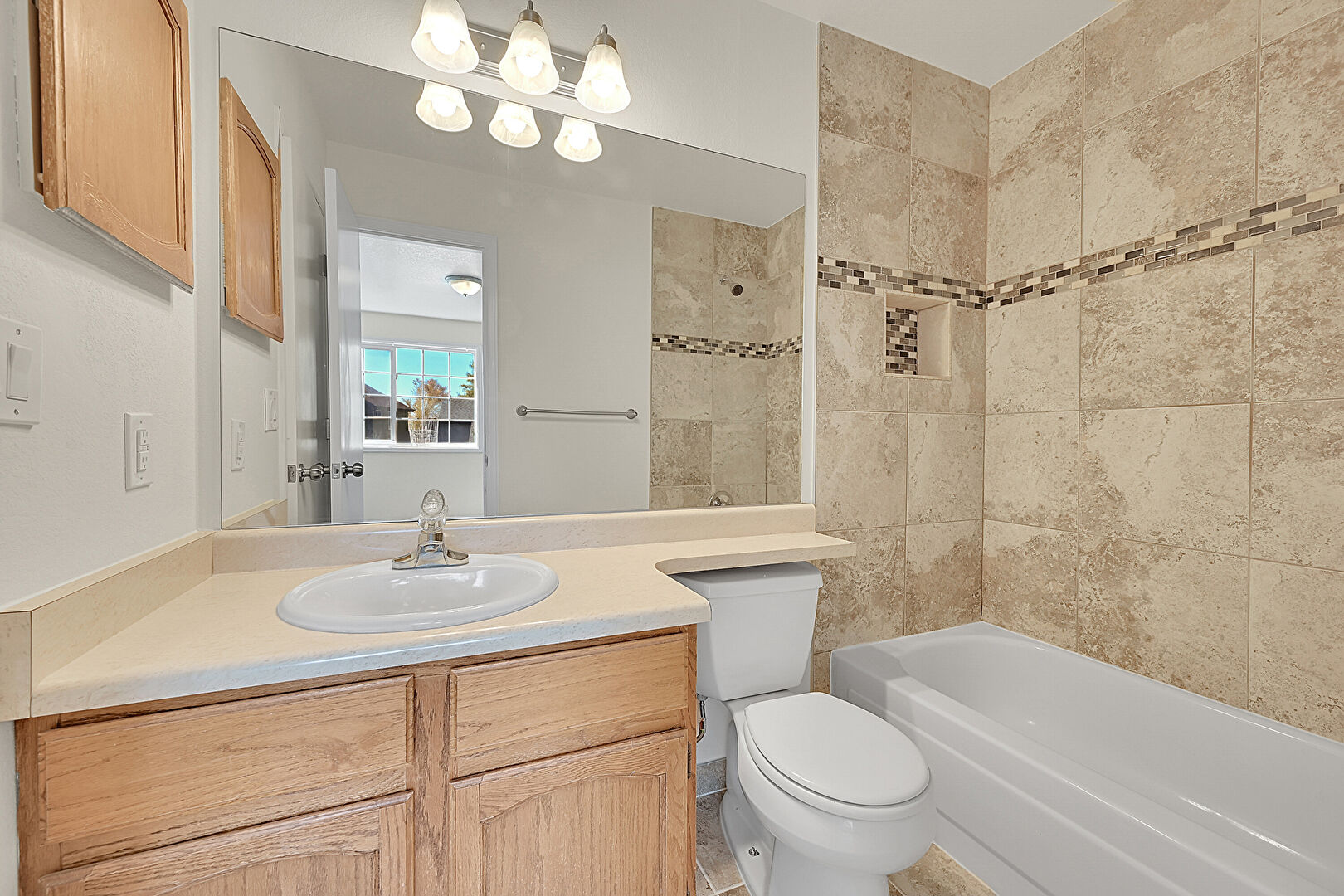 Combined Bath Shower, Drywall, Full Bathroom, Natural Light, Tile Floor, Vanity, Drywall, Vanity