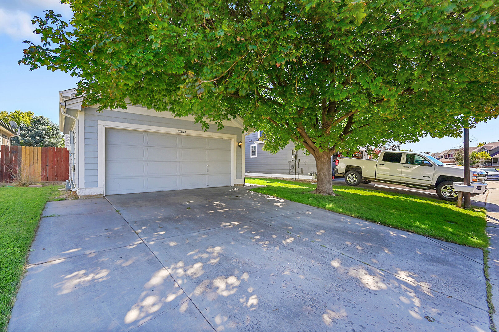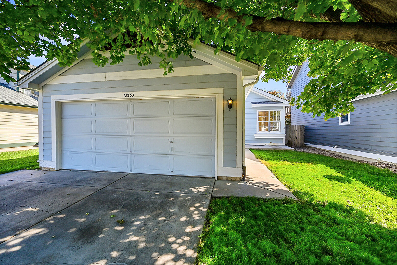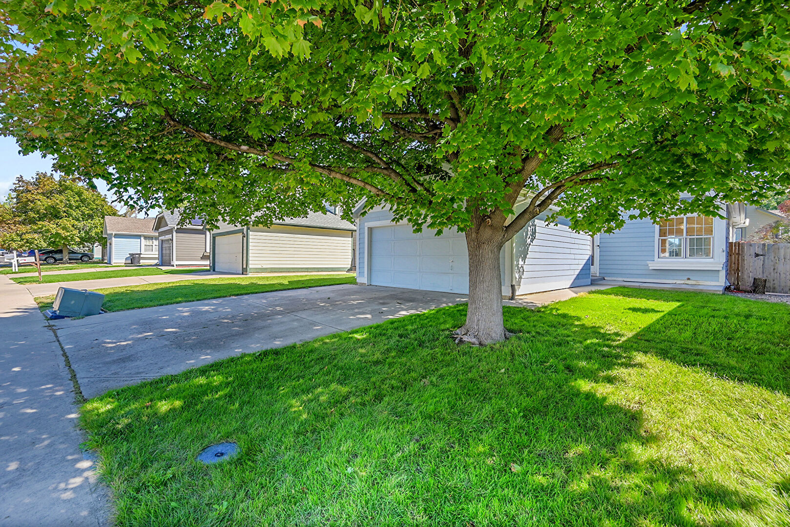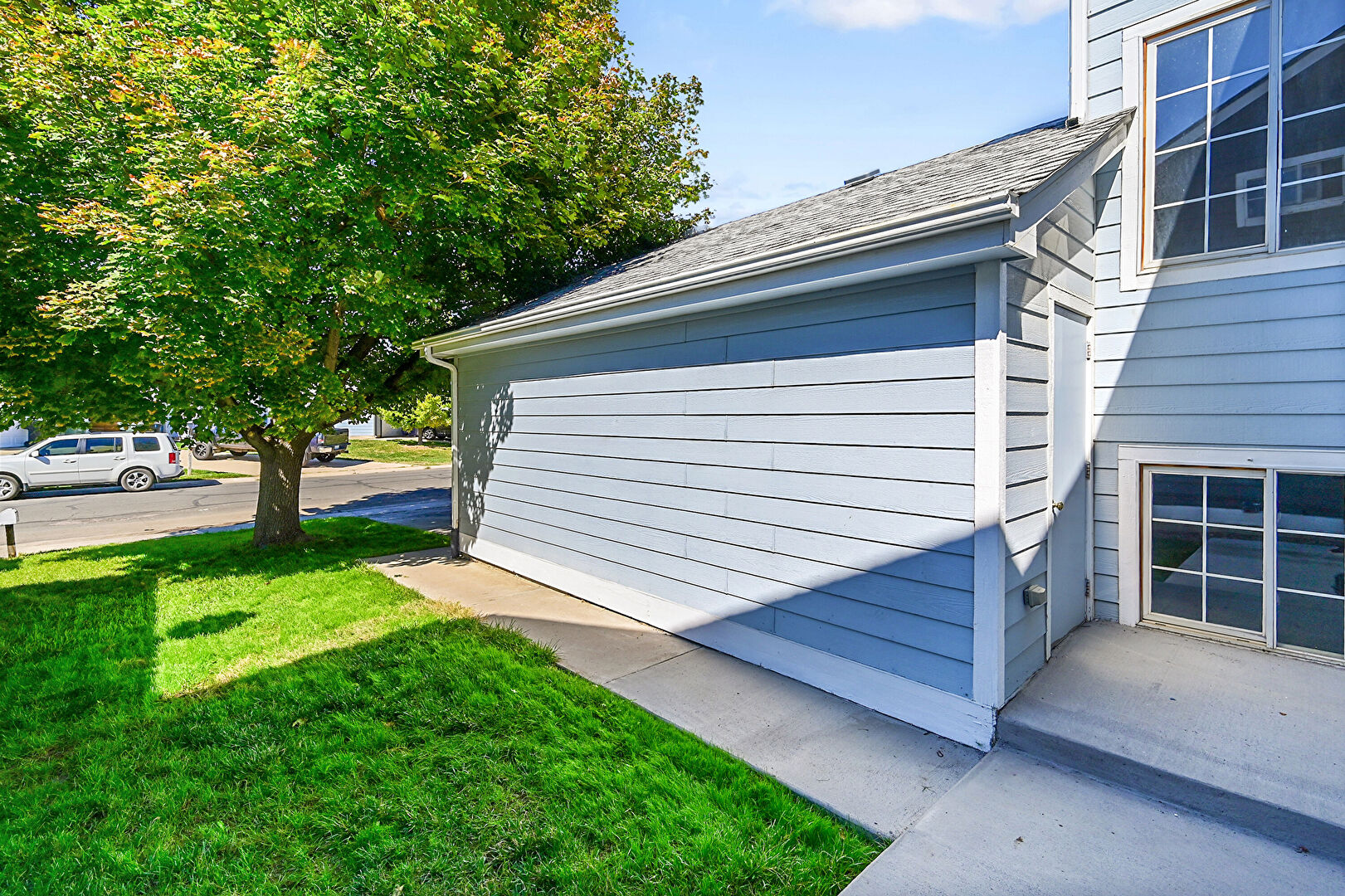 Concrete Foundation, Downspout, Driveway, Fence, Garage, Gutters, Horizontal Siding, Lawn, Shingle Roof, Driveway, Fence, Garage